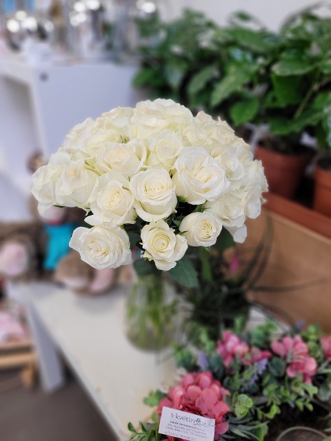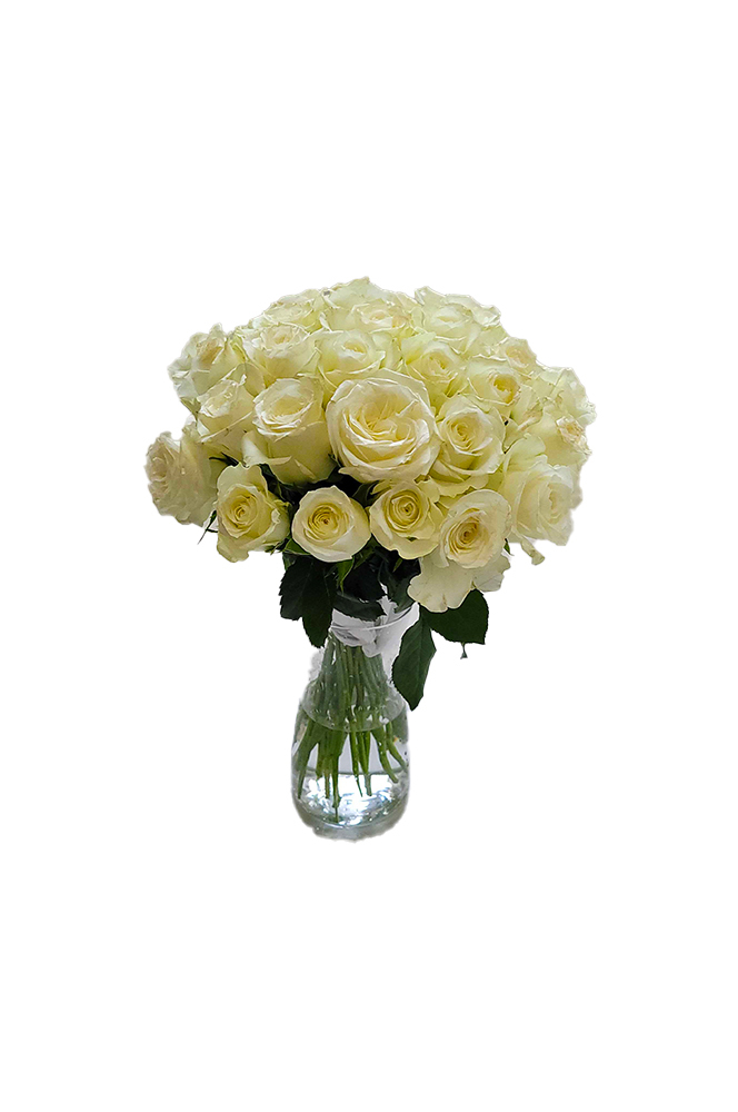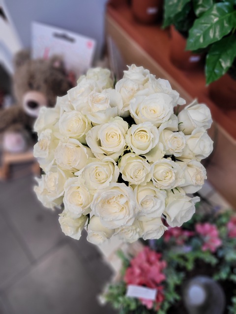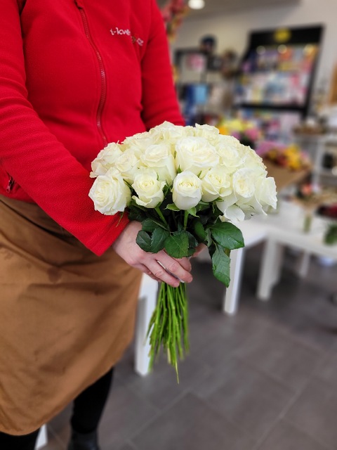 Třicet čerstvých bílých růží délky 40cm, svázaných stuhou v barvě květů. Pošlete překvapení plné lásky až domů nebo do práce. Rozvoz růží Ostrava.