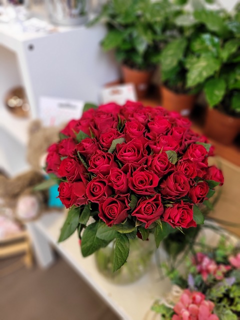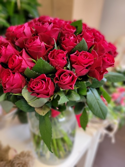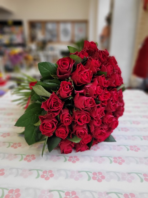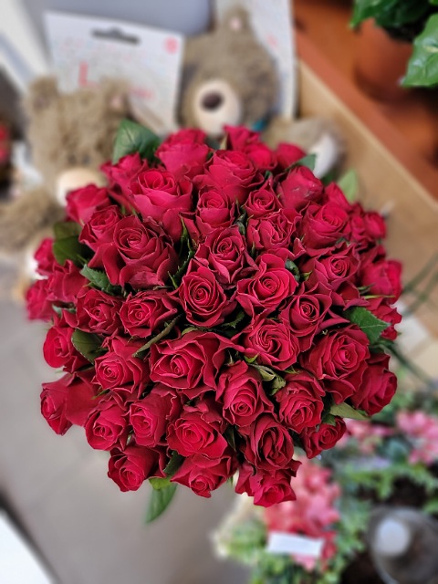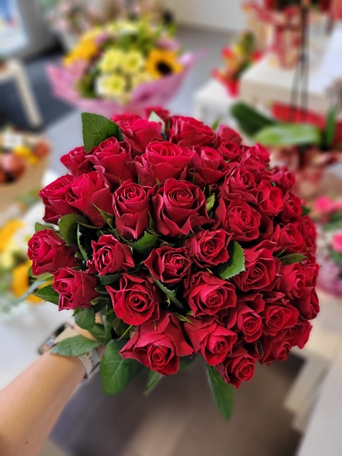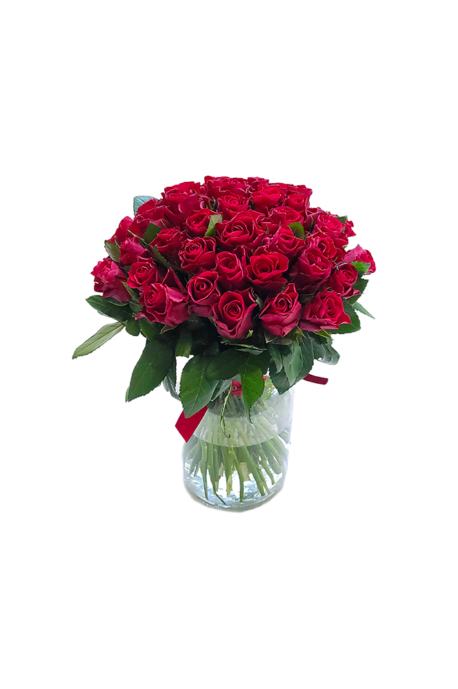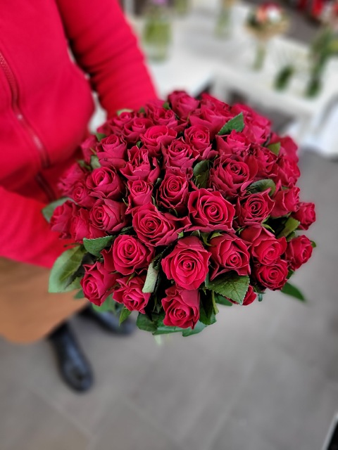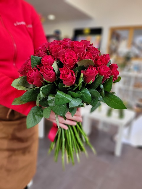 Padesát čerstvých červených růží délky 40cm, svázaných stuhou v barvě květů. Pošlete překvapení plné lásky až domů nebo do práce. Rozvoz růží Ostrava.
