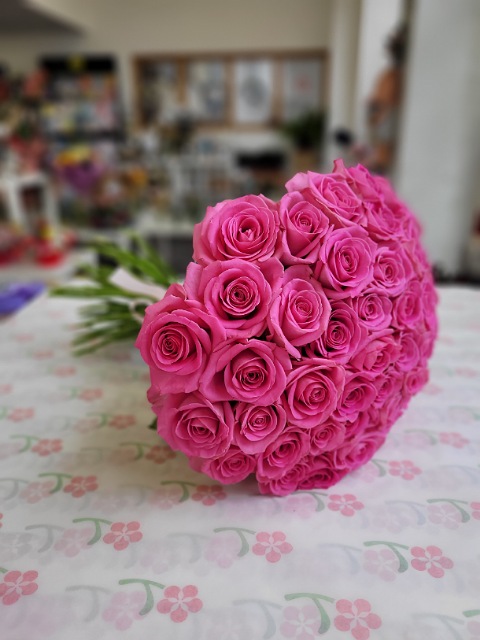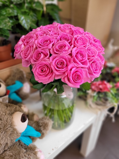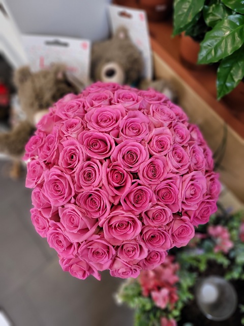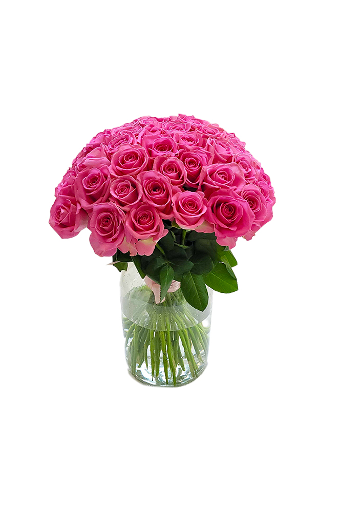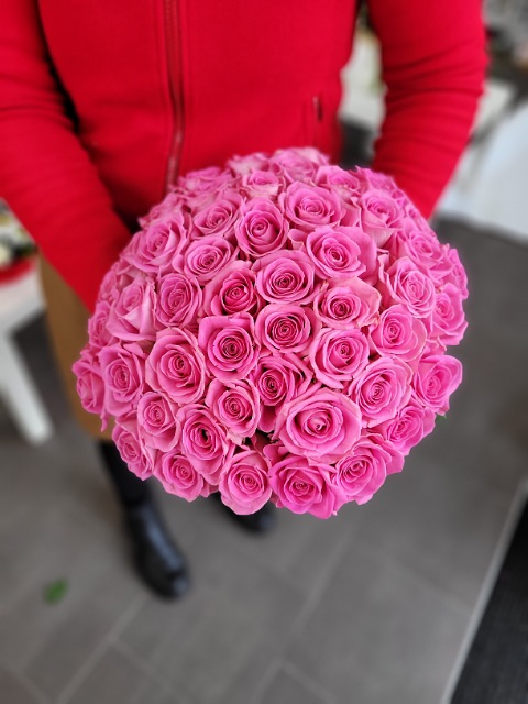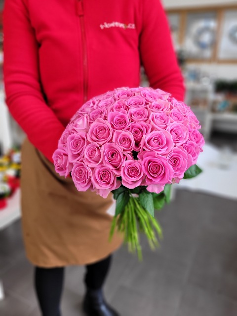 Padesát čerstvých růžových růží délky 40cm, svázaných stuhou v barvě květů. Pošlete překvapení plné lásky až domů nebo do práce. Rozvoz růží Ostrava.