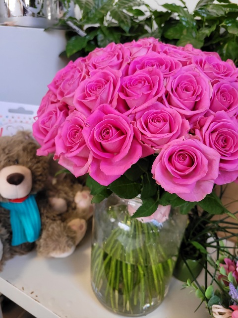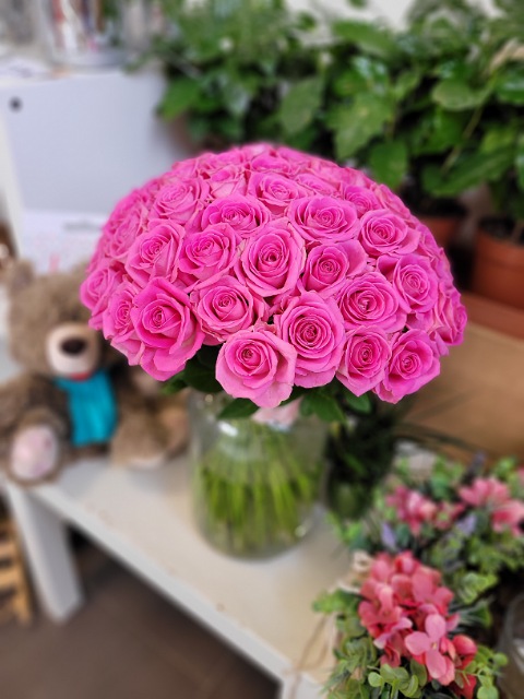 Šedesát čerstvých růžových růží délky 40cm, svázaných stuhou v barvě květů. Pošlete překvapení plné lásky až domů nebo do práce. Rozvoz růží Ostrava.
