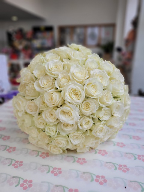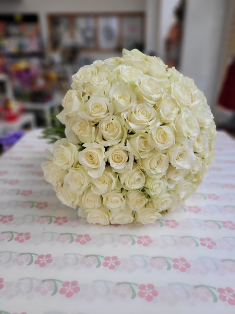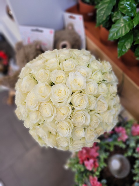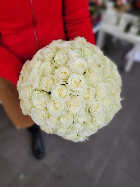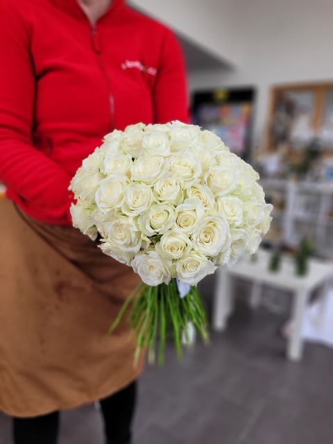 Osmdesát čerstvých bílých růží délky 40cm, svázaných stuhou v barvě květů. Pošlete překvapení plné lásky až domů nebo do práce. Rozvoz růží Ostrava.
