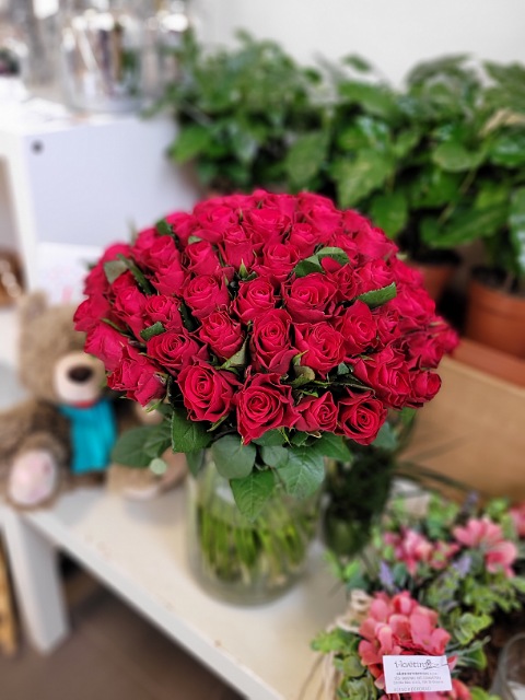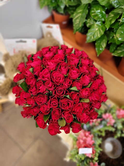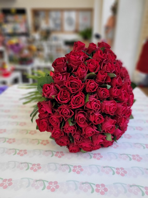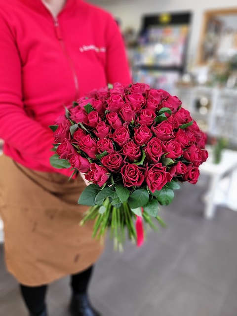 Osmdesát čerstvých červených růží délky 40cm, svázaných stuhou v barvě květů. Pošlete překvapení plné lásky až domů nebo do práce. Rozvoz růží Ostrava.