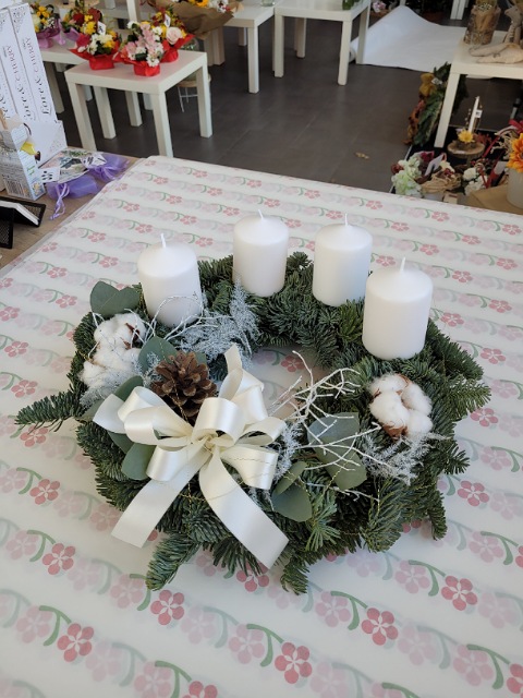 Bílý adventní věnec se svíčkami u sebe