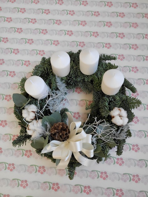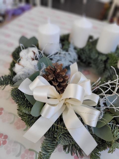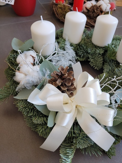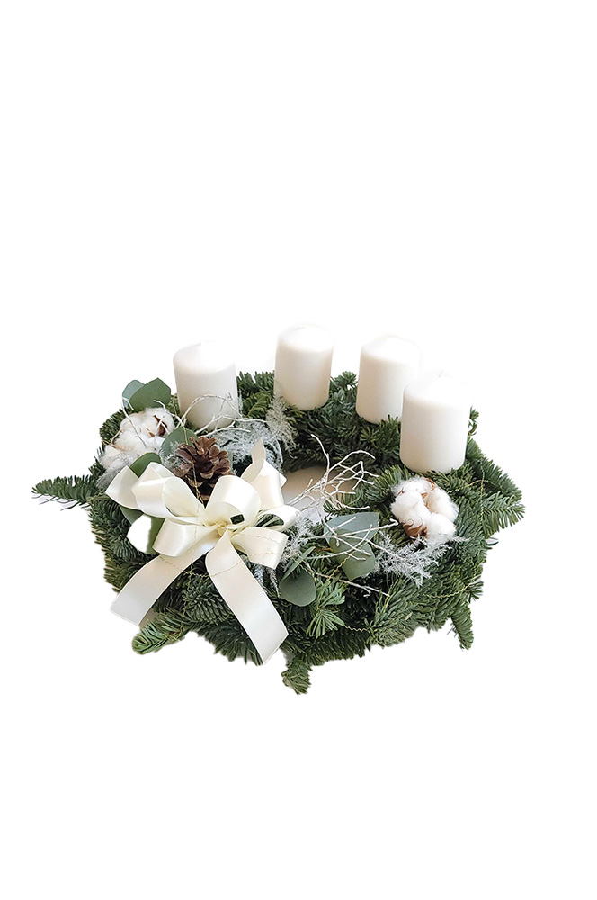 Adventní věnec z nobilisu s bílými svíčkami, bavlníkem, eukalyptem a šiškou.