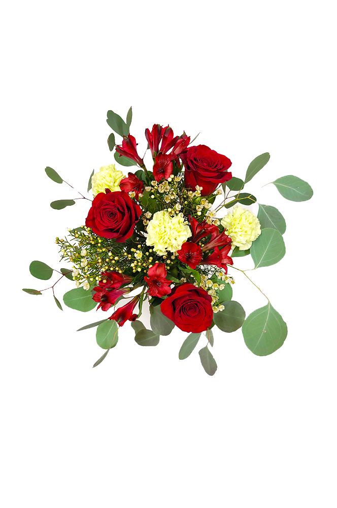 Vsaďte na nadčasovou eleganci s touto podmanivou kyticí. Dominantní červené růže, symbol lásky a vášně, jsou zde doplněny červenými alstromeriemi, které aranžmá dodávají bohatost a jemnost. Netradiční akcent v podobě světle zelených karafiátů vnáší do kytice moderní kontrast a neotřelý vzhled. Celou kytici dotváří jemný bílý wax a zelené listy eukalyptu, které kytici dodávají vzdušnost a příjemnou přírodní vůni.