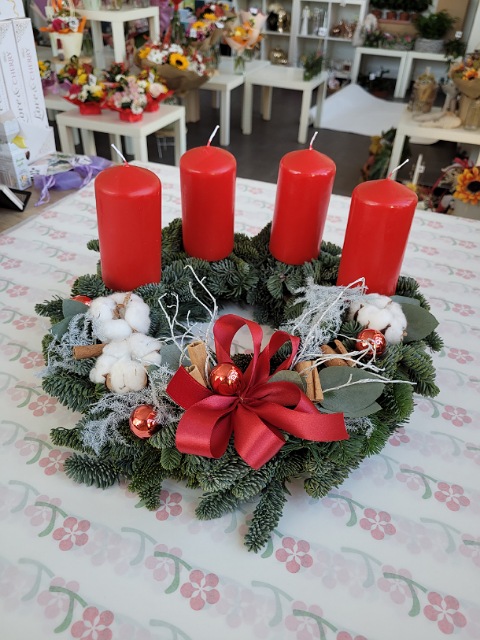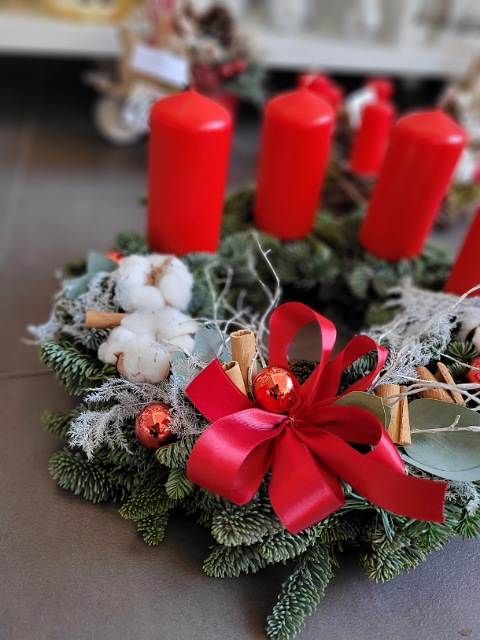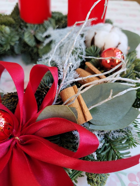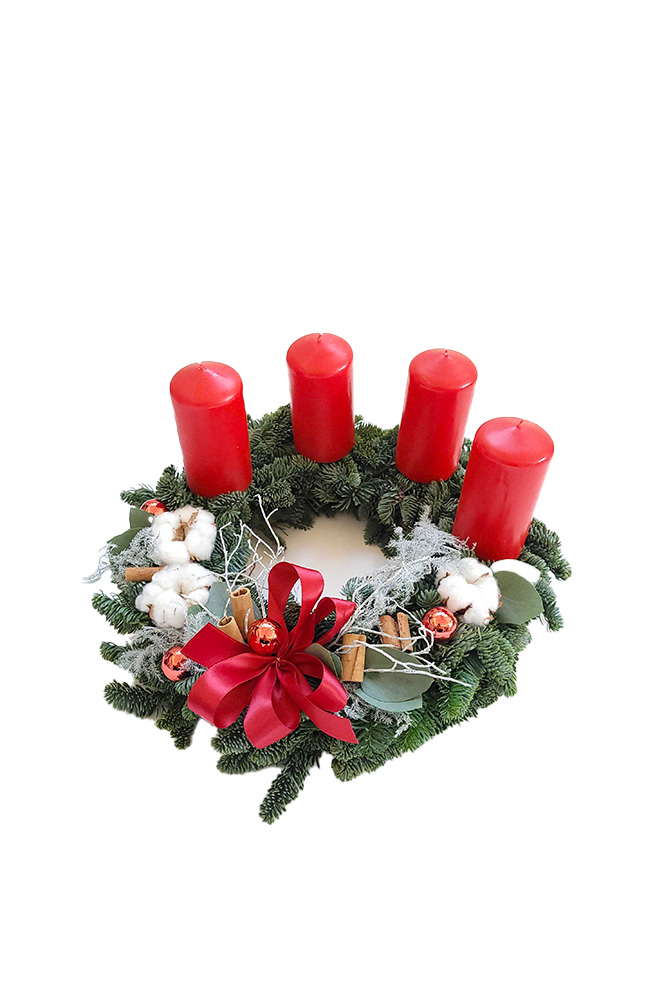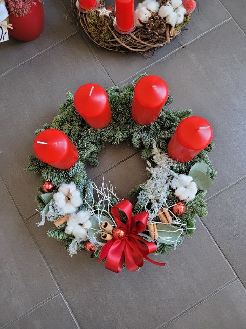 Adventní věnec z nobilisu s červenými svíčkami, bavlníkem, eukalyptem a skořicí.