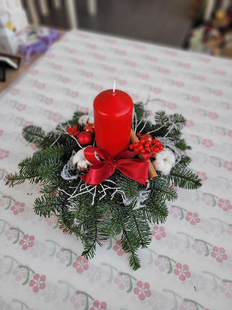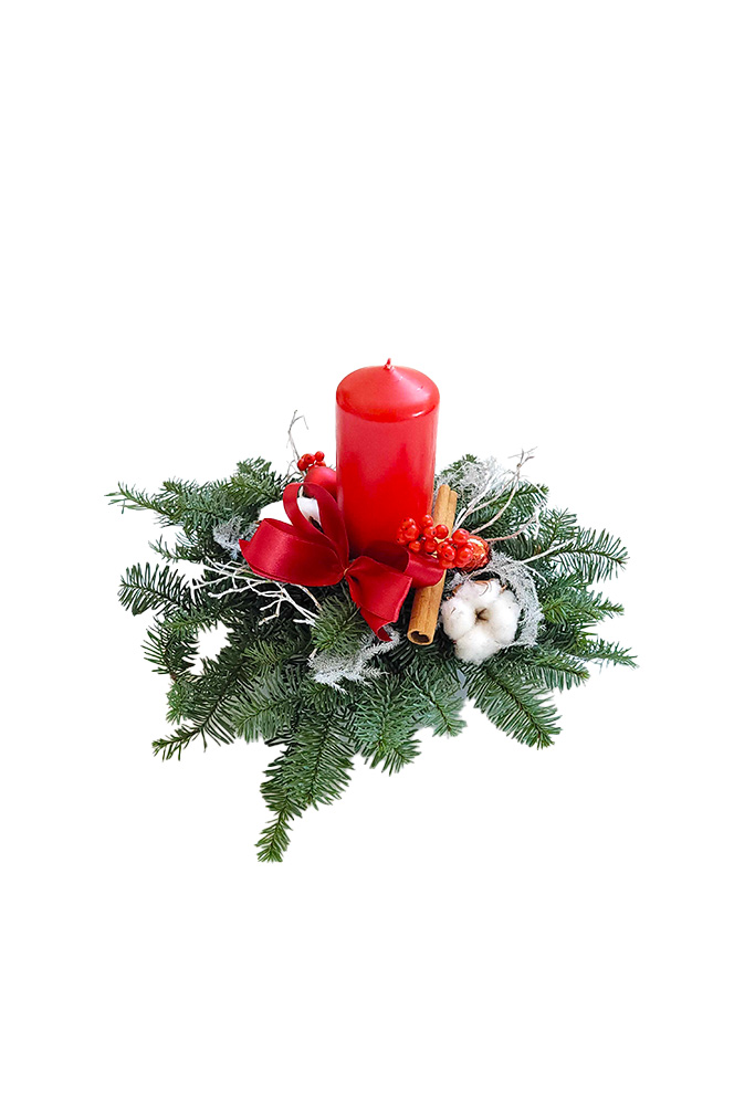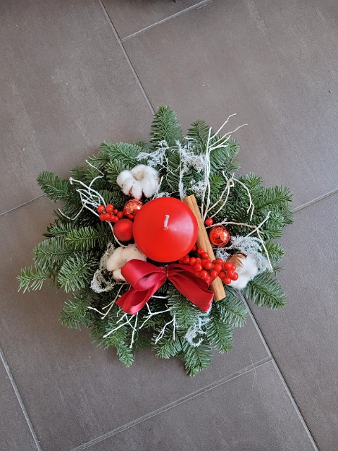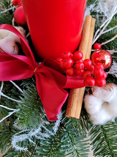 Stylový červený vánoční svícen z větviček nobilisu s jednou červenou svíčkou je perfektní dekorací pro vánoční stůl nebo komodu. Svícen je ozdoben bavlníkem, eukalyptem, skořicí, ilexem a drobnými červenými baňkami, doplněn červenou stuhou, která mu dodá slavnostní vzhled.