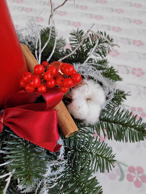 Červený vánoční svícen z chvojí s červenou svíčkou, zdobený bavlníkem, eukalyptem, skořicí, ilexem a saténovou stuhou.