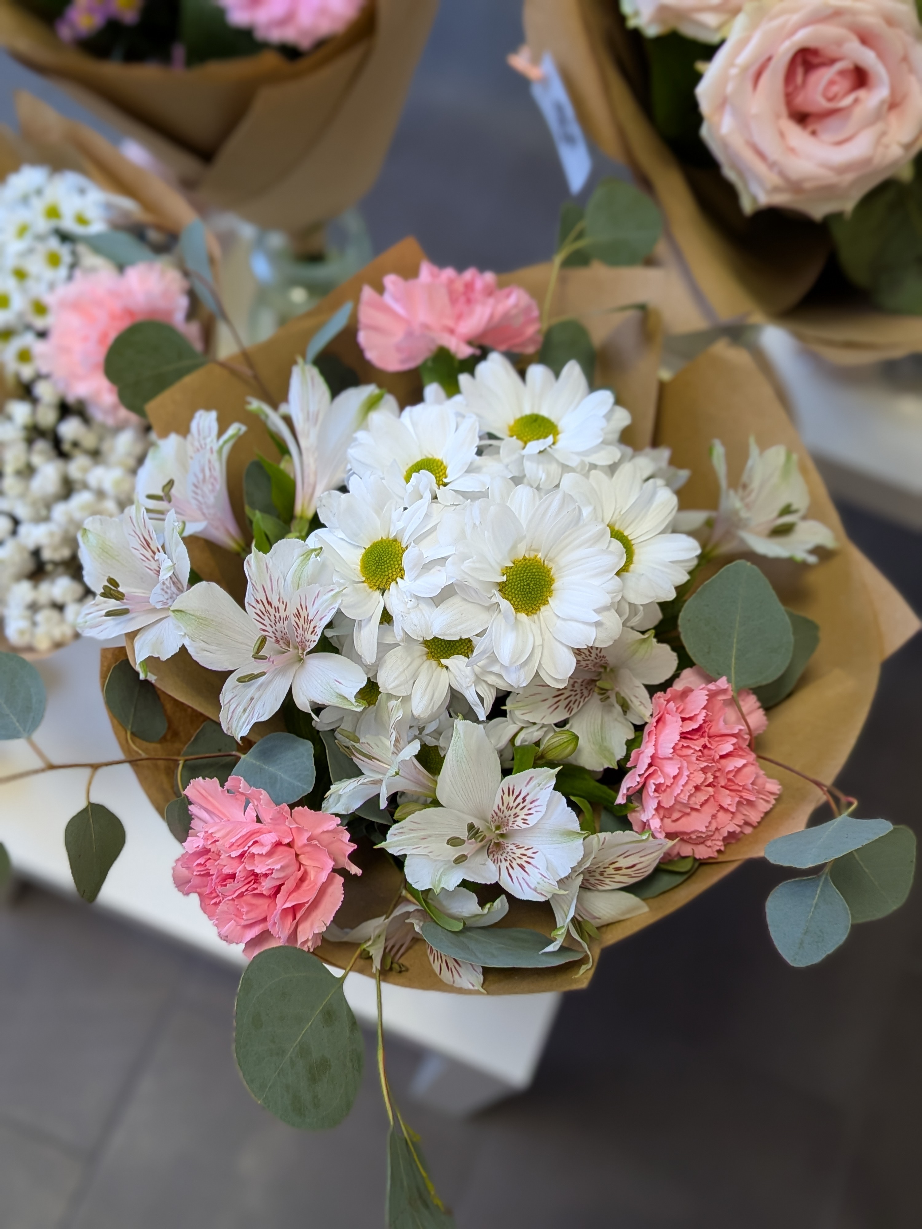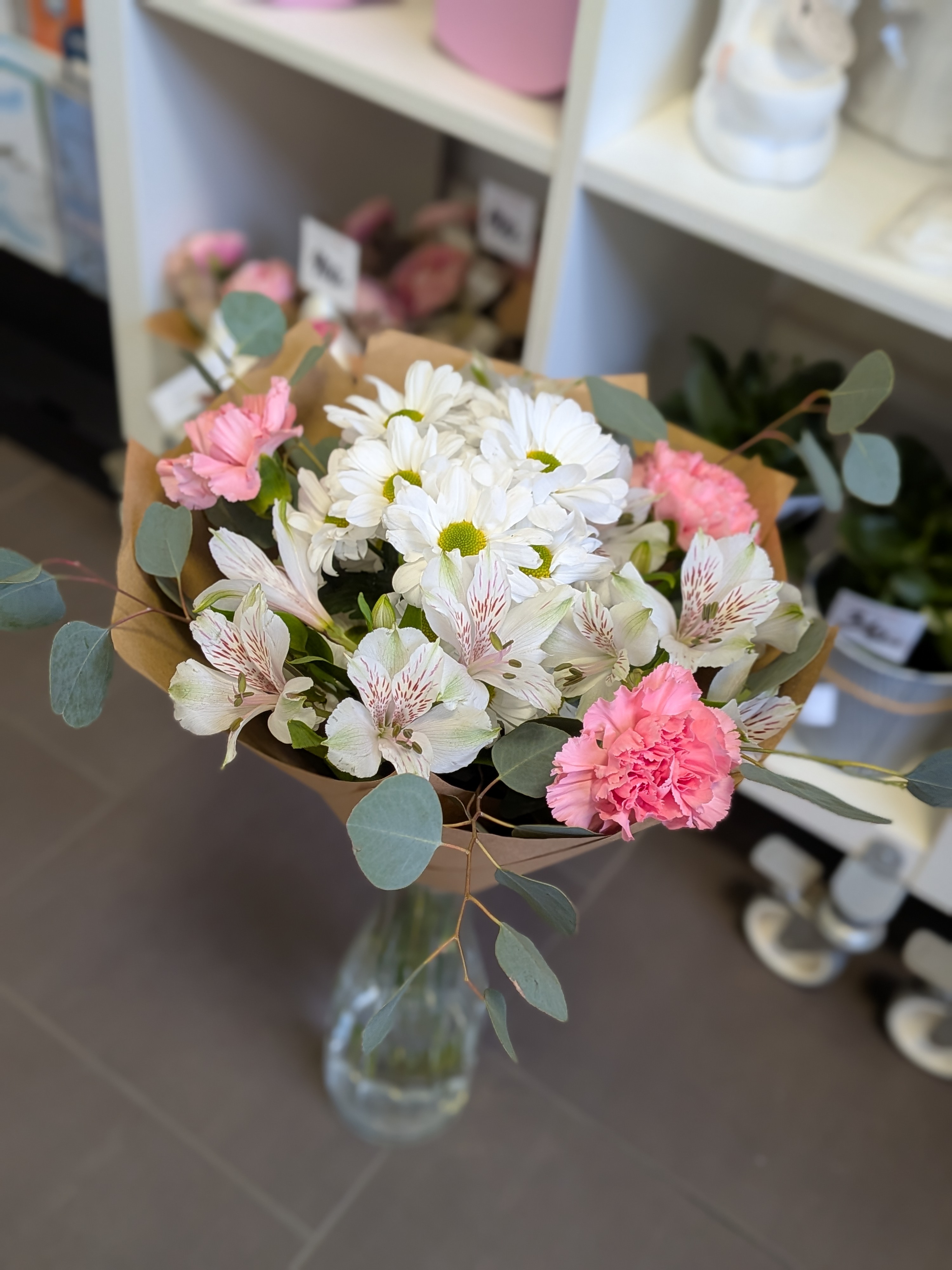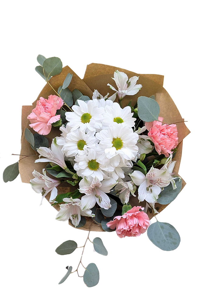 Něžná kombinace bílé chryzantémy a alstromerií, doplněná růžovými karafiáty.