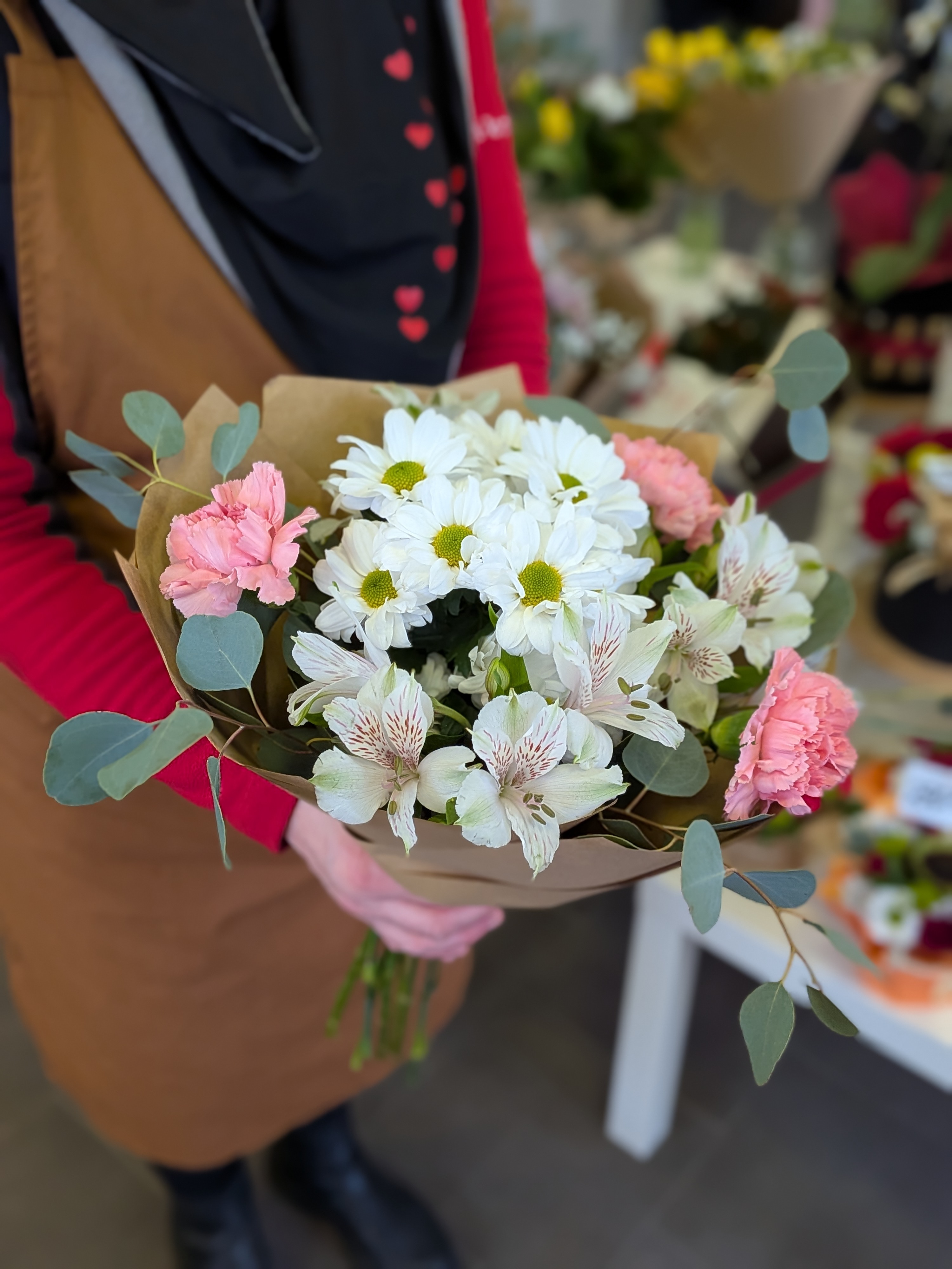 Chryzantéma, růžové karafiáty a alstromerie