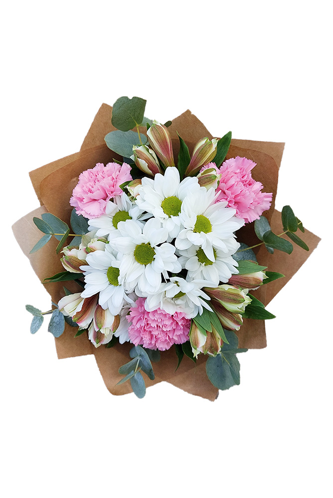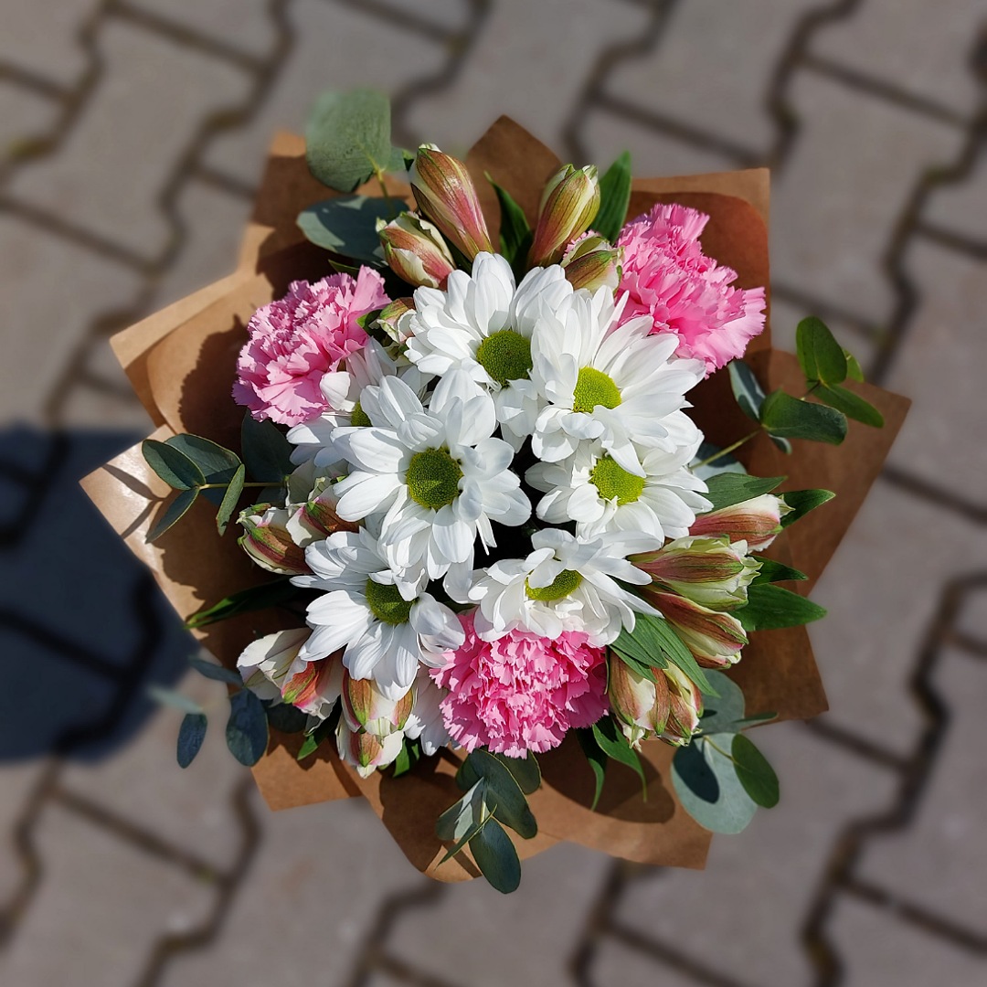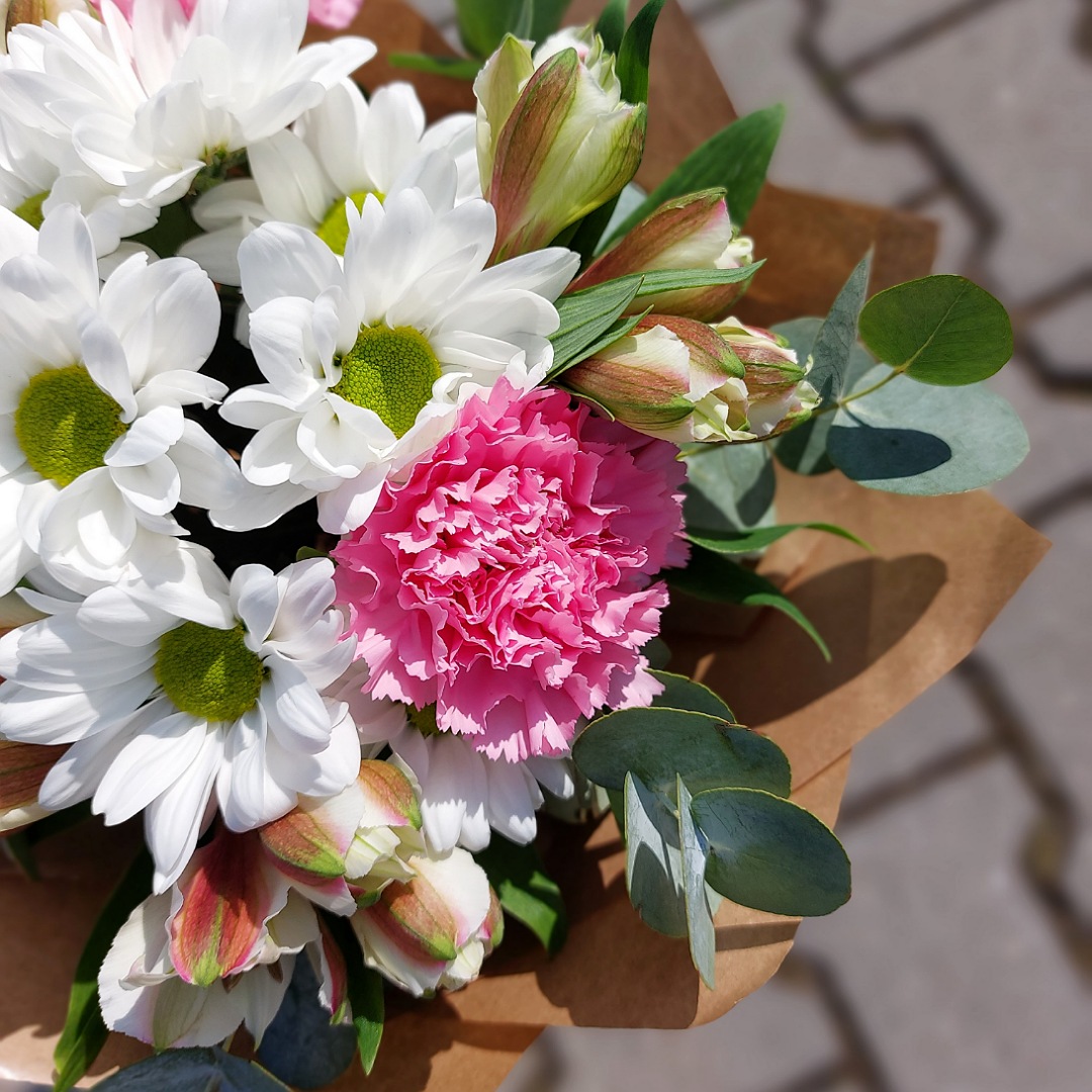 Něžná kombinace bílé chryzantémy a alstromerií, doplněná růžovými karafiáty.