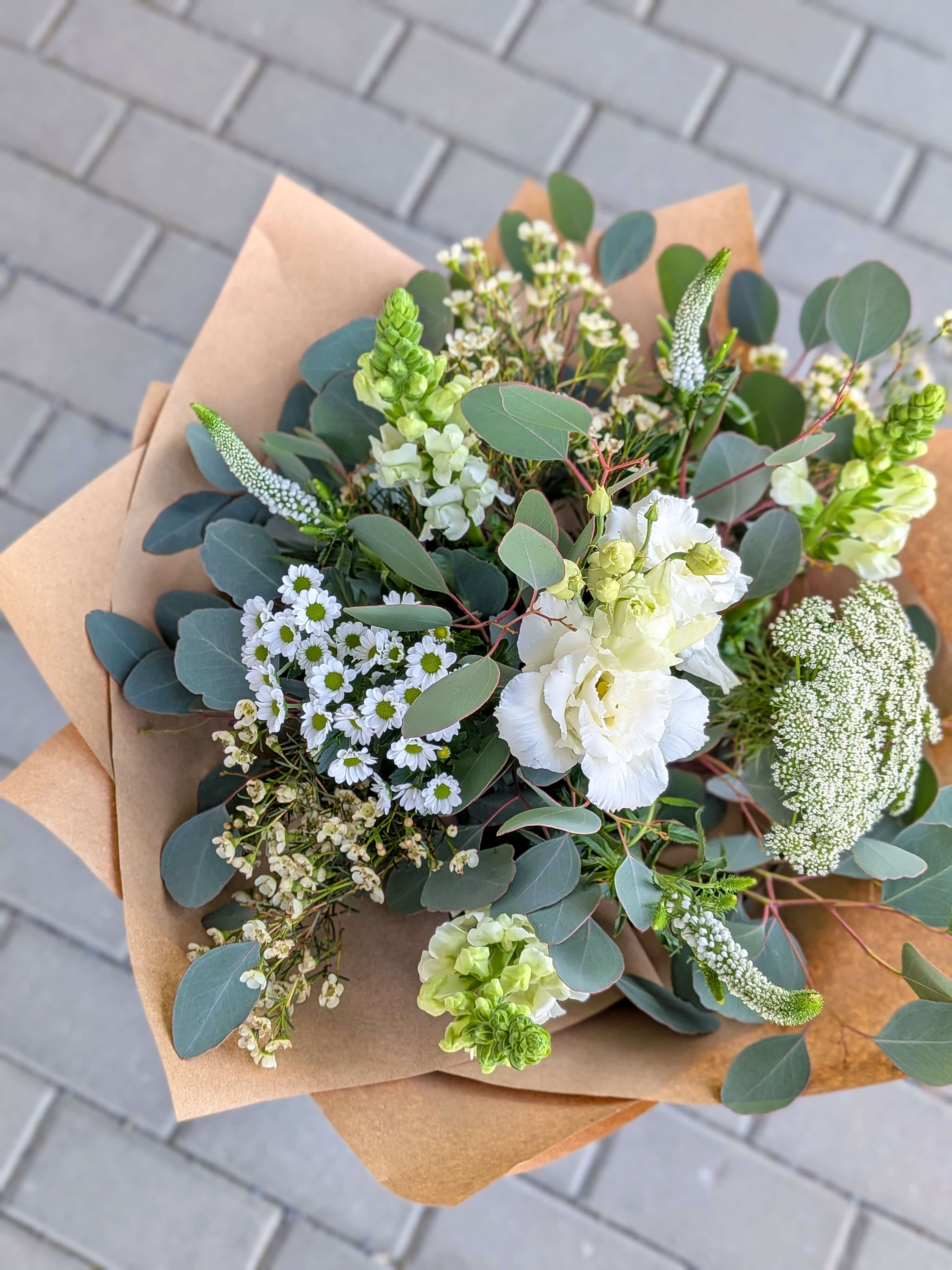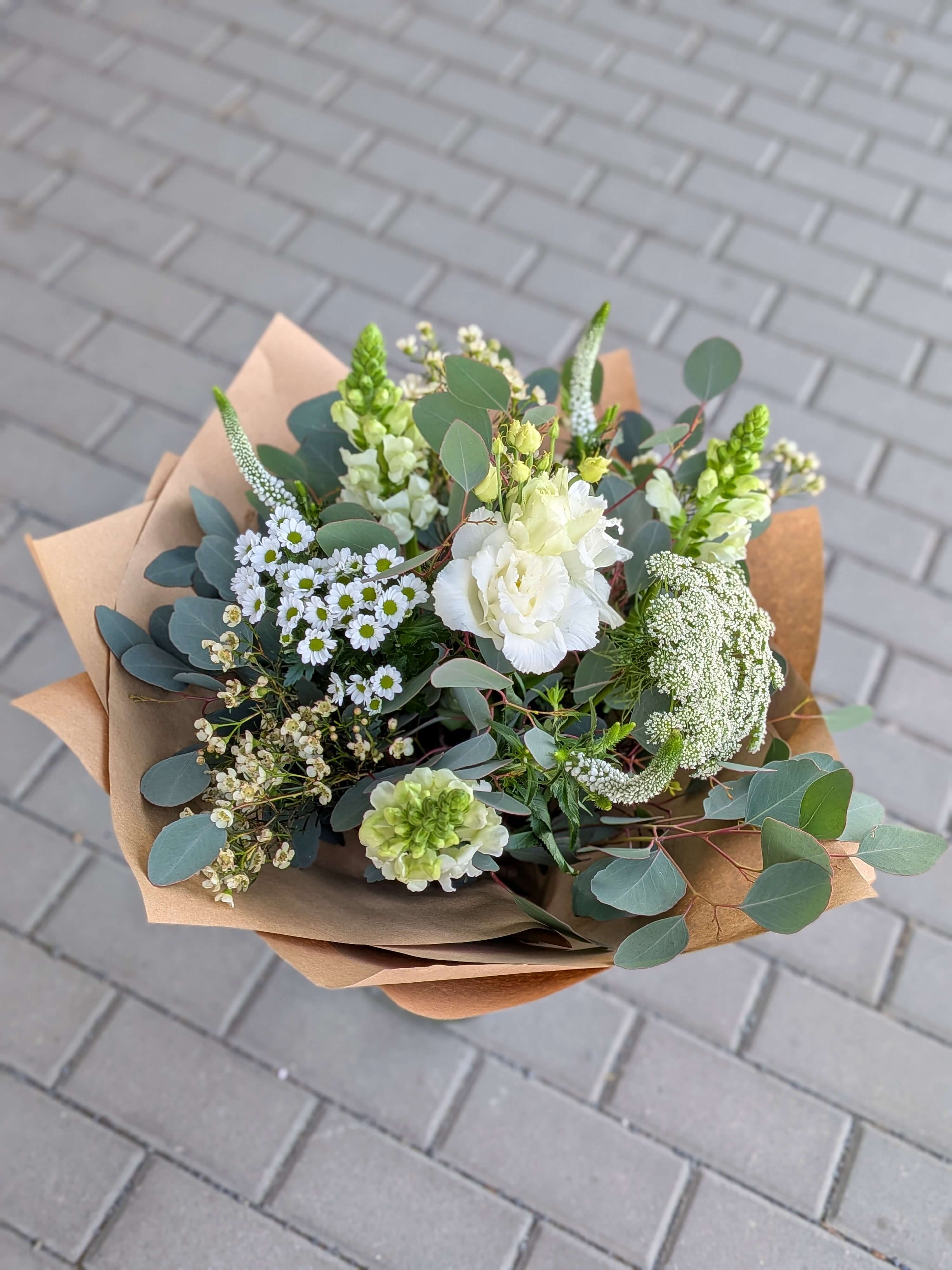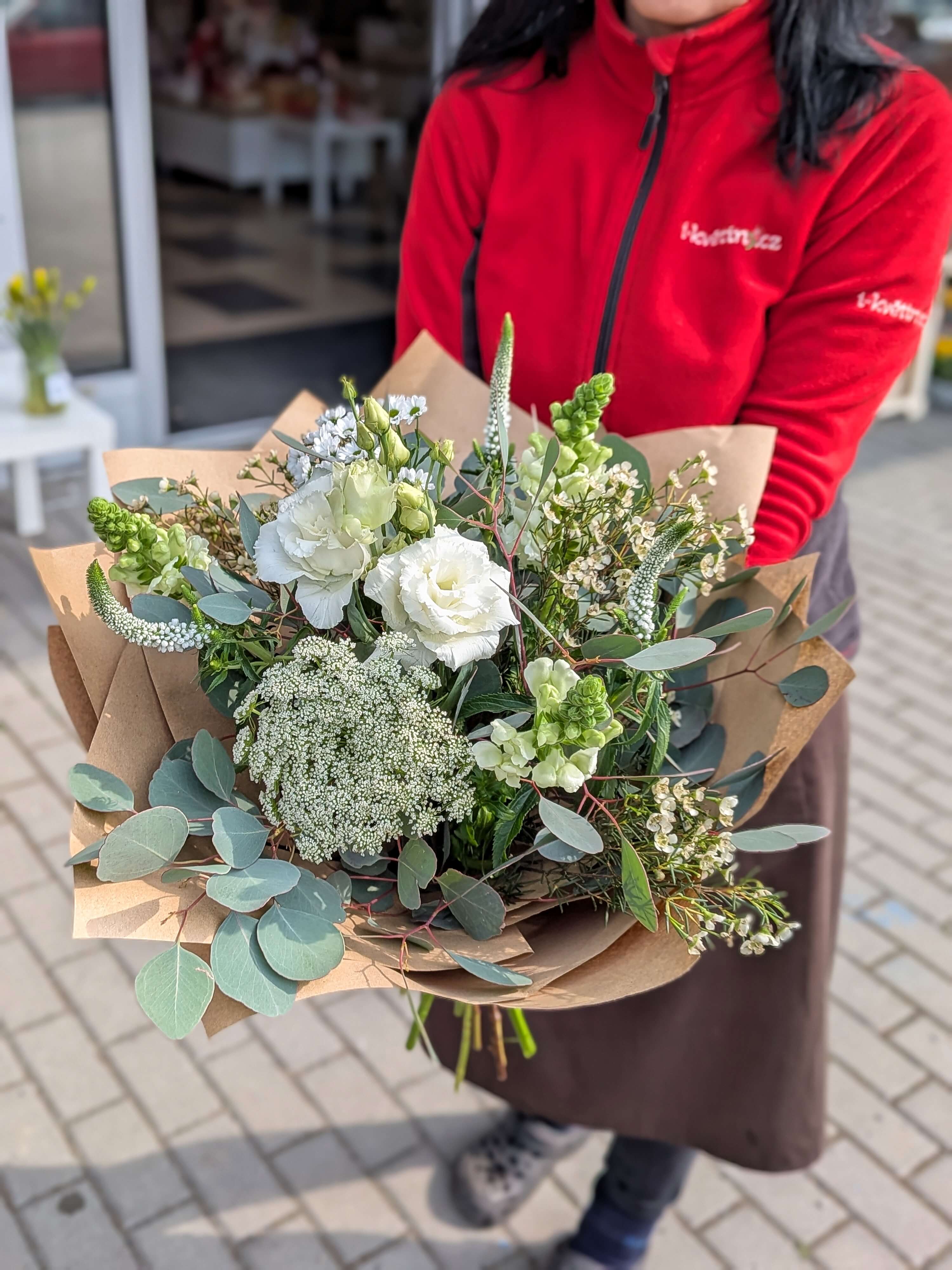 Vneste do prostoru klid a nadčasovou eleganci s touto bohatou kyticí v čistých bílých a jemných zelených tónech. Skladba květin, které dominuje půvabná eustoma a vznešené bílé hledíky, působí velmi sofistikovaně a zároveň přirozeně. Jemnost celému aranžmá dodává nadýchané ammi a veronica, zatímco drobné kvítky waxu a svěží eukalyptus podtrhují její texturu a dodávají kytici lehký luční nádech s puncem luxusu.