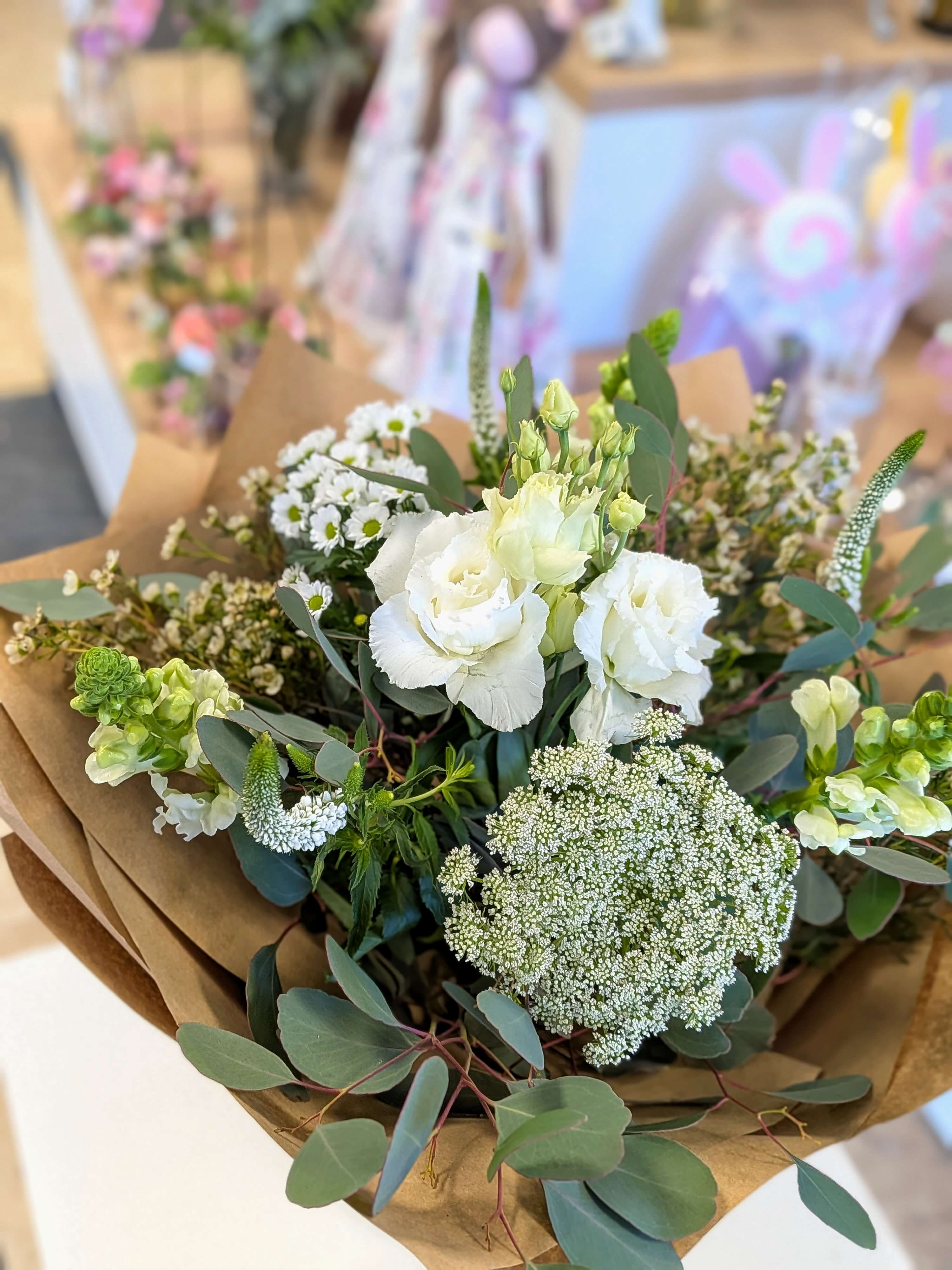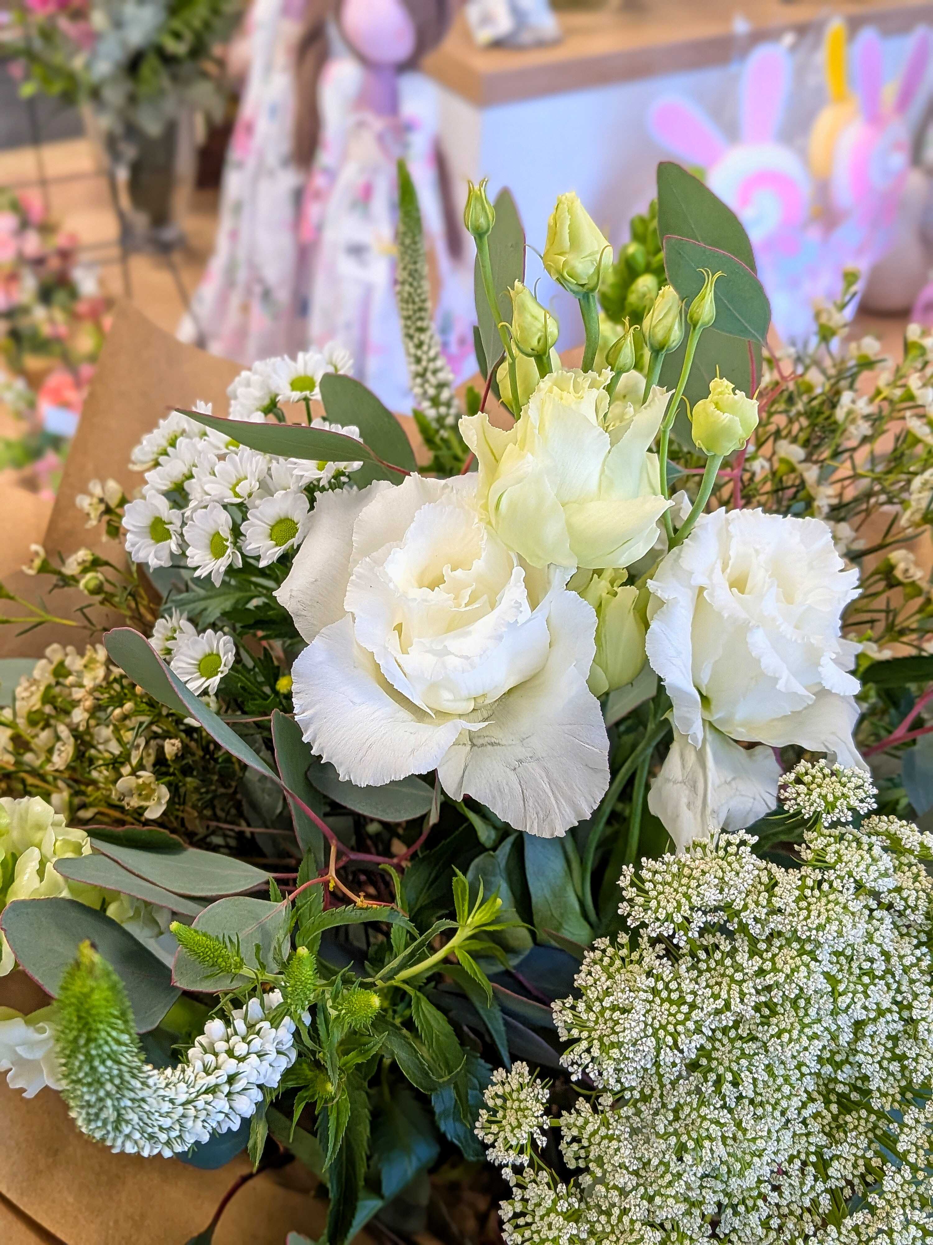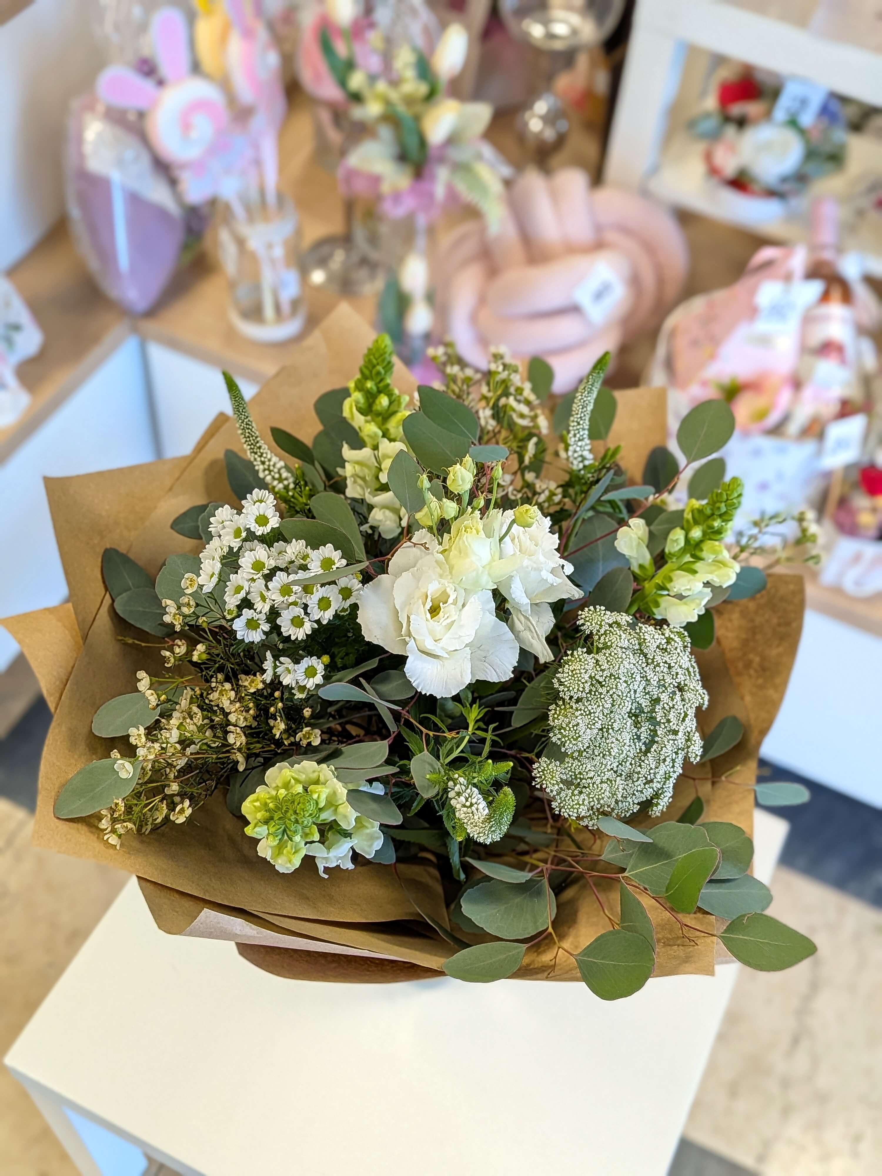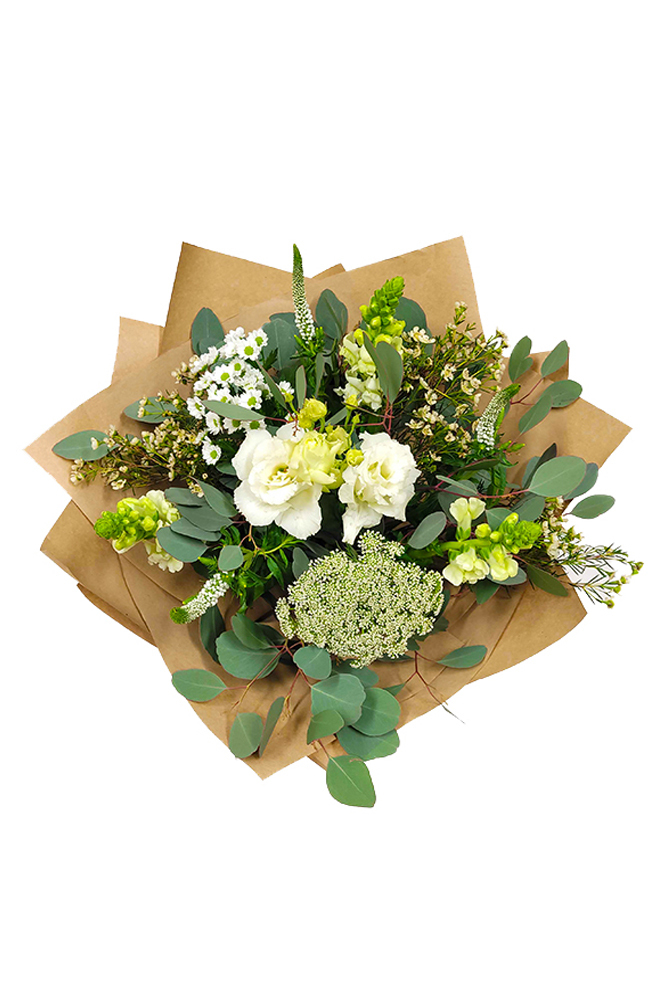 Vneste do prostoru klid a nadčasovou eleganci s touto bohatou kyticí v čistých bílých a jemných zelených tónech. Skladba květin, které dominuje půvabná eustoma a vznešené bílé hledíky, působí velmi sofistikovaně a zároveň přirozeně. Jemnost celému aranžmá dodává nadýchané ammi a veronica, zatímco drobné kvítky waxu a svěží eukalyptus podtrhují její texturu a dodávají kytici lehký luční nádech s puncem luxusu.