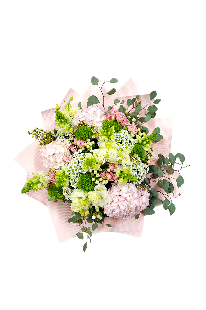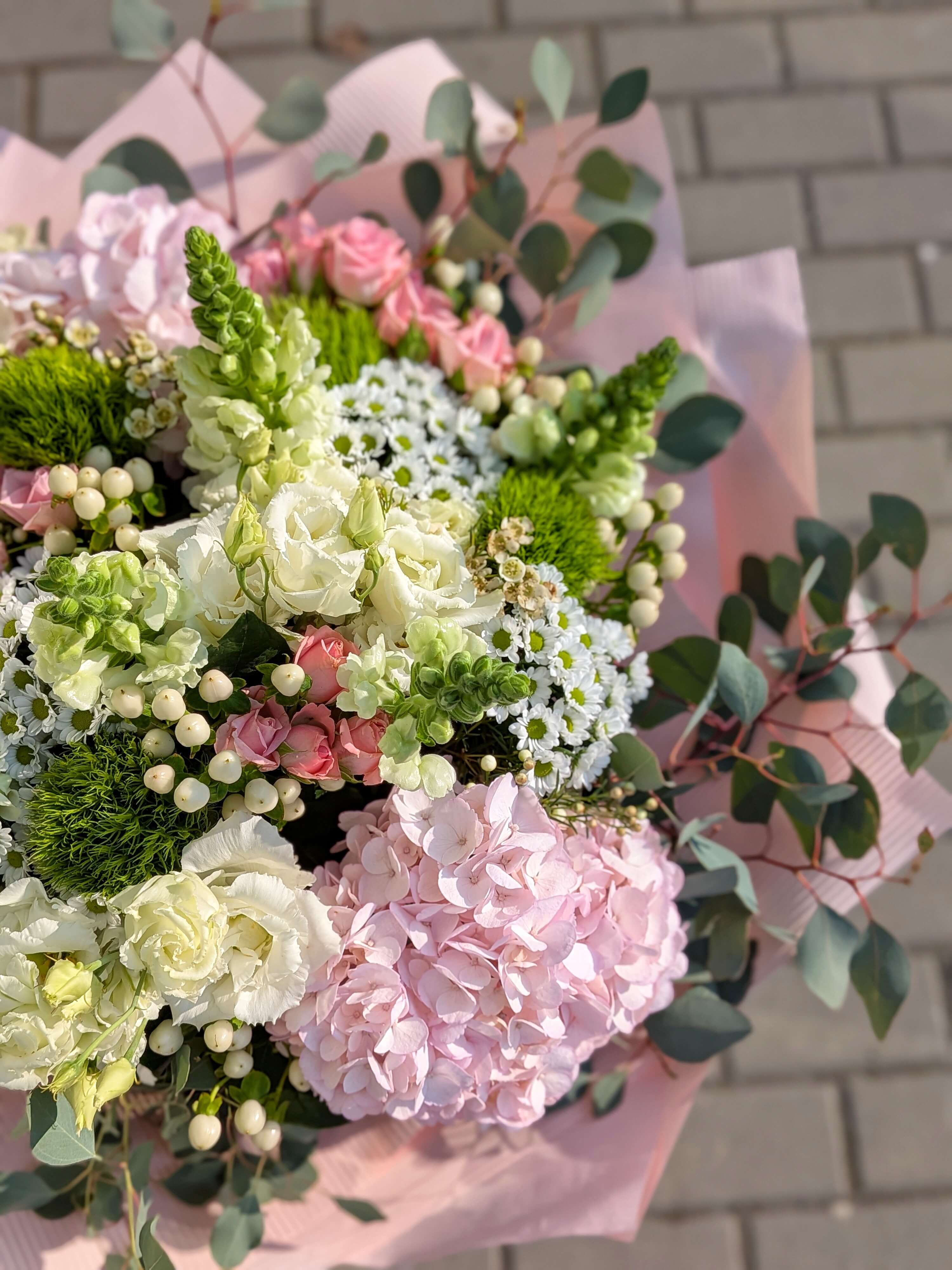 Hledáte-li kytici, která vyrazí dech svou velikostí a elegancí, tato bohatá vazba je tou pravou volbou. Dominantou jsou tři velkolepé růžové hortenzie, které symbolizují hojnost a ušlechtilost. Vznešenost dodává sedm bílých hledíků, zatímco pětice růžových trsových růží a bílé eustomy vnášejí do vazby romantickou jemnost. Unikátní texturu zajišťují zelené mechové karafiáty a bílé santinky, které spolu s jemným waxem a stříbřitým eukalyptem vytvářejí nadýchaný, luxusní celek. Vše je dotaženo k dokonalosti světle růžovou manžetou, která podtrhuje slavnostní ráz této velké kytice.