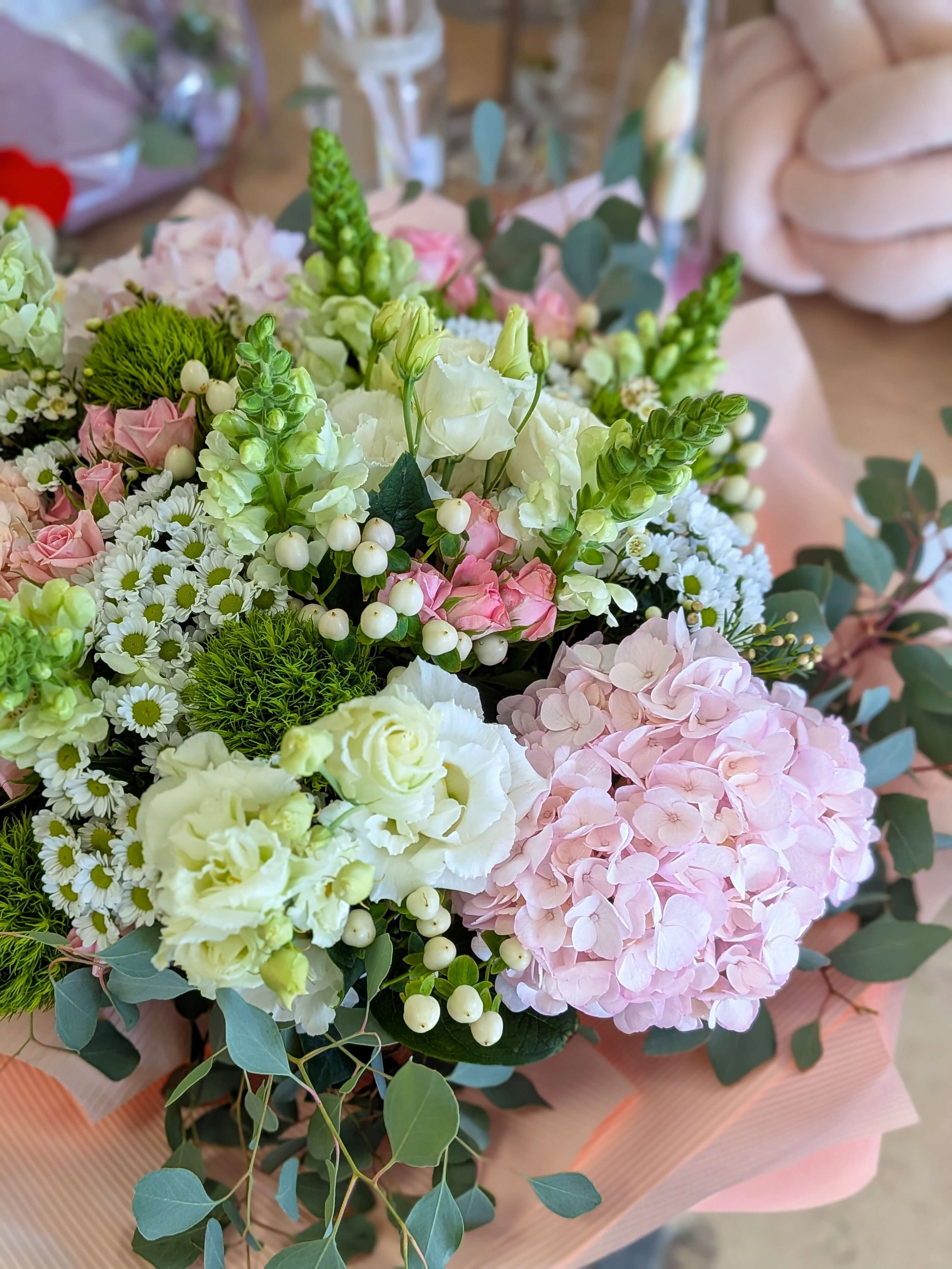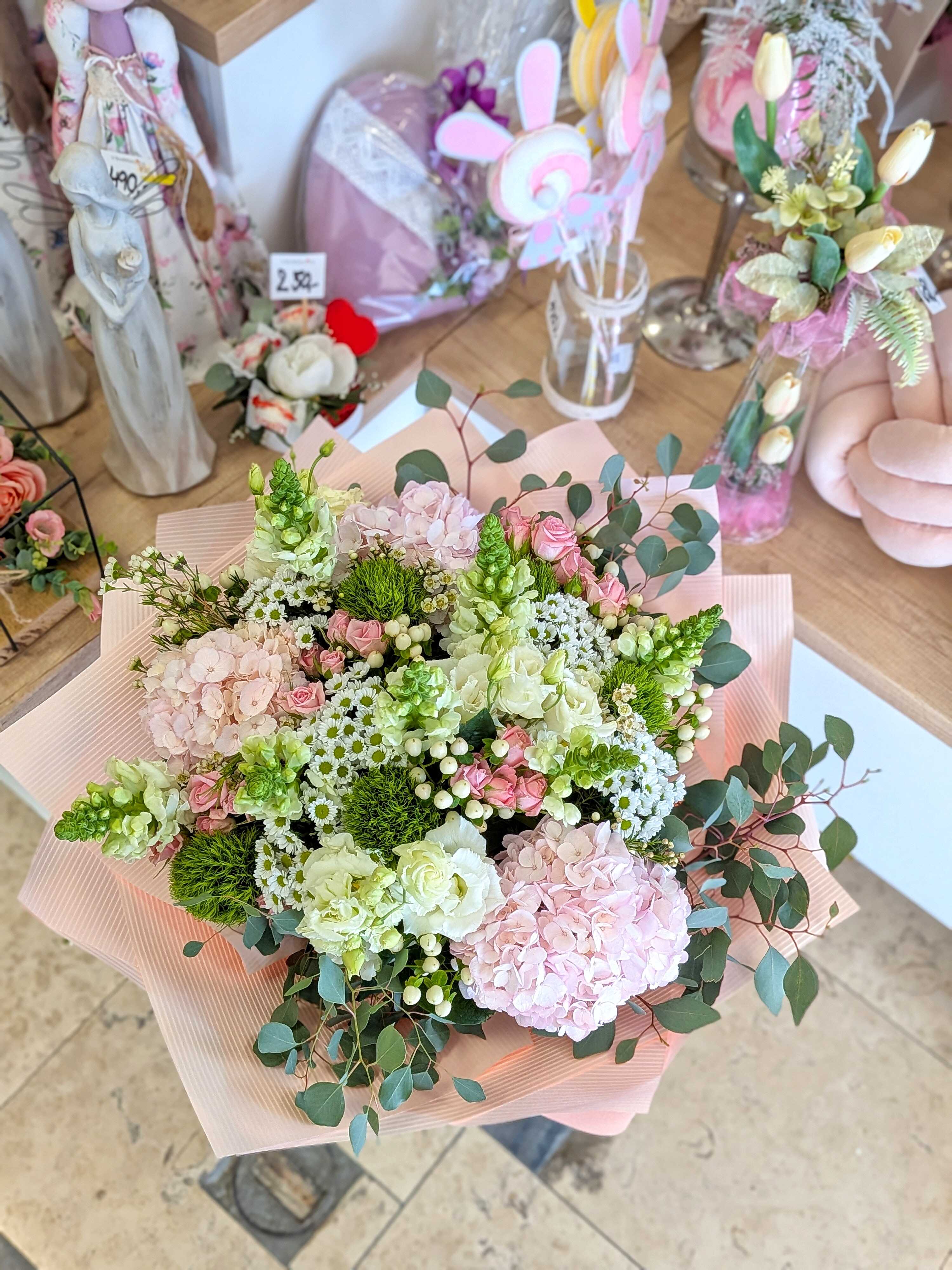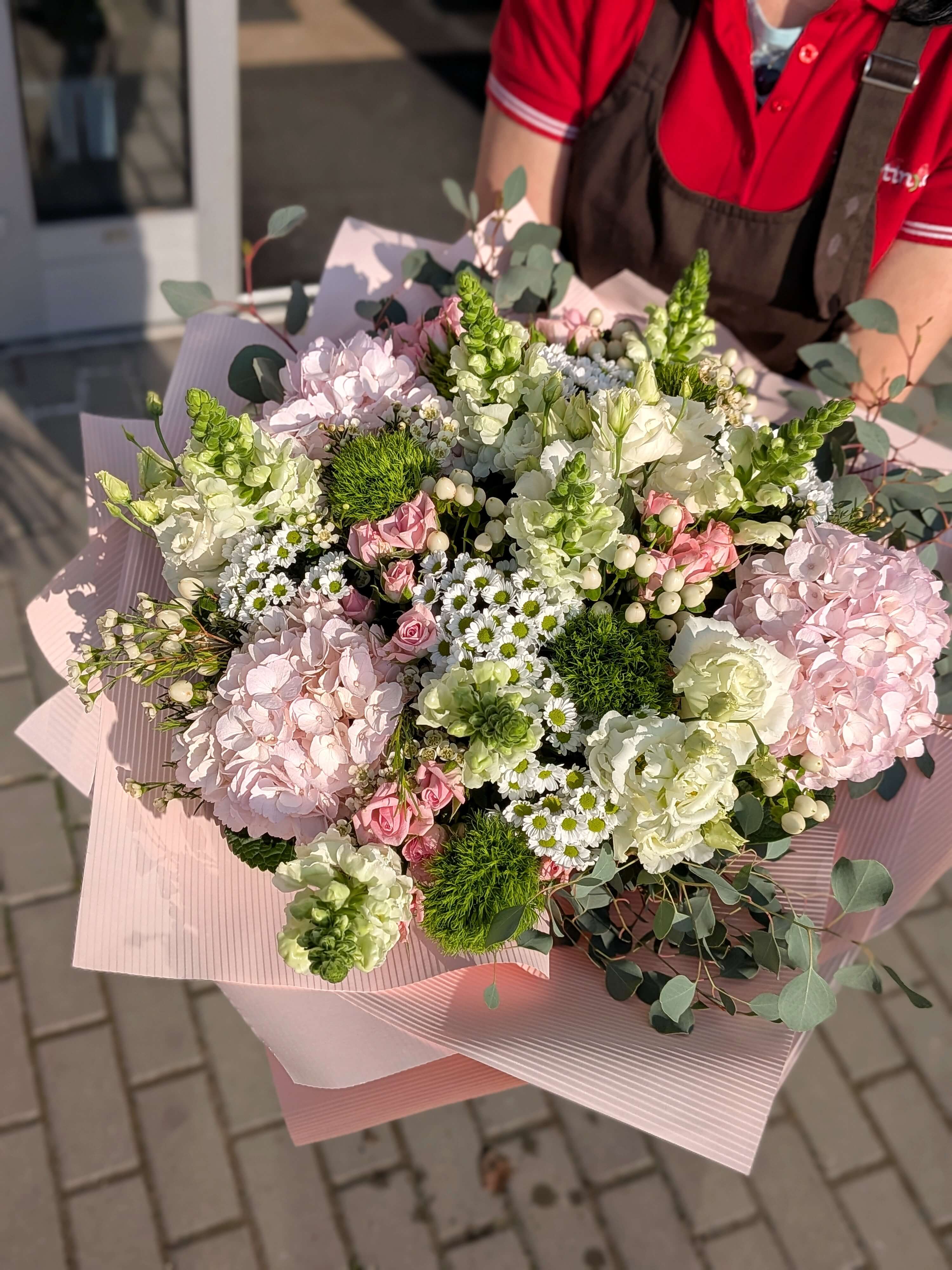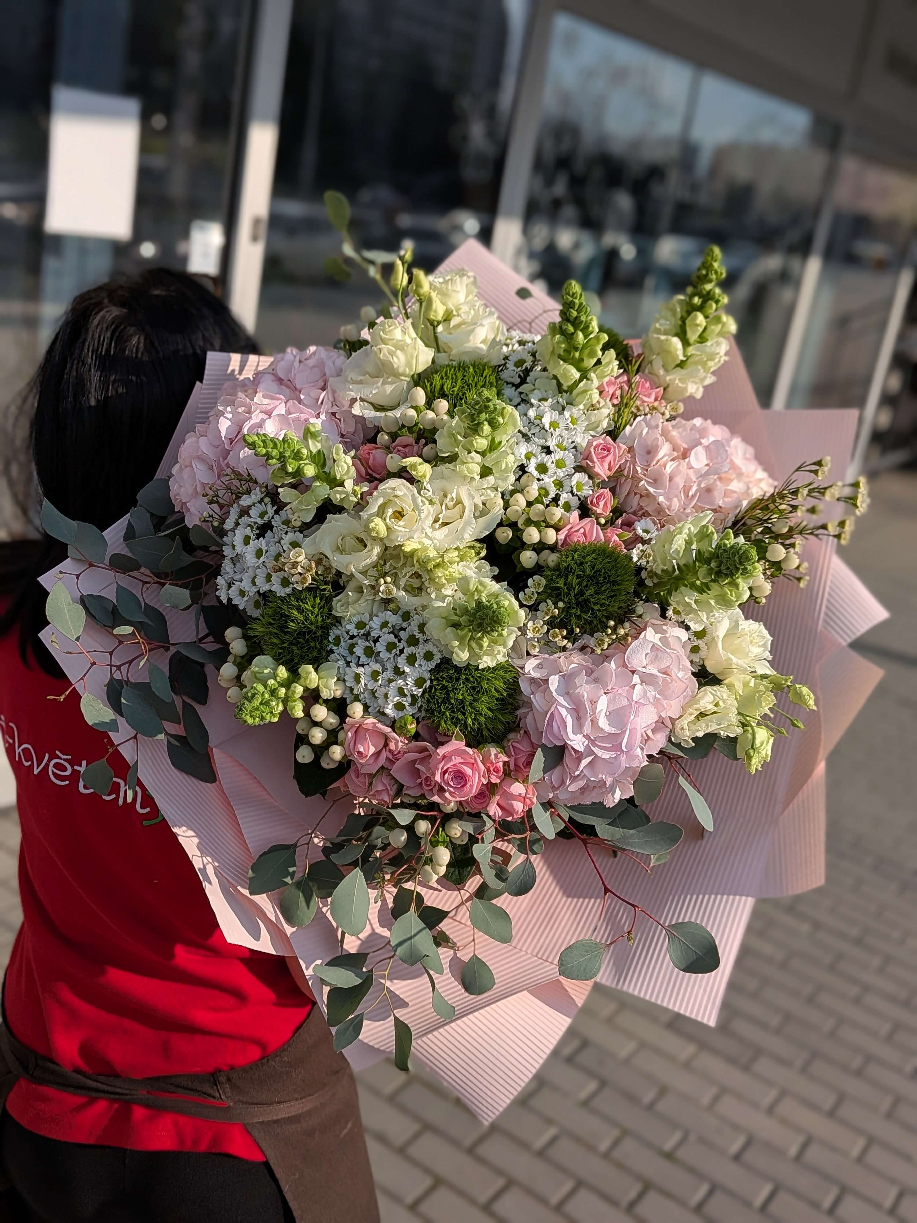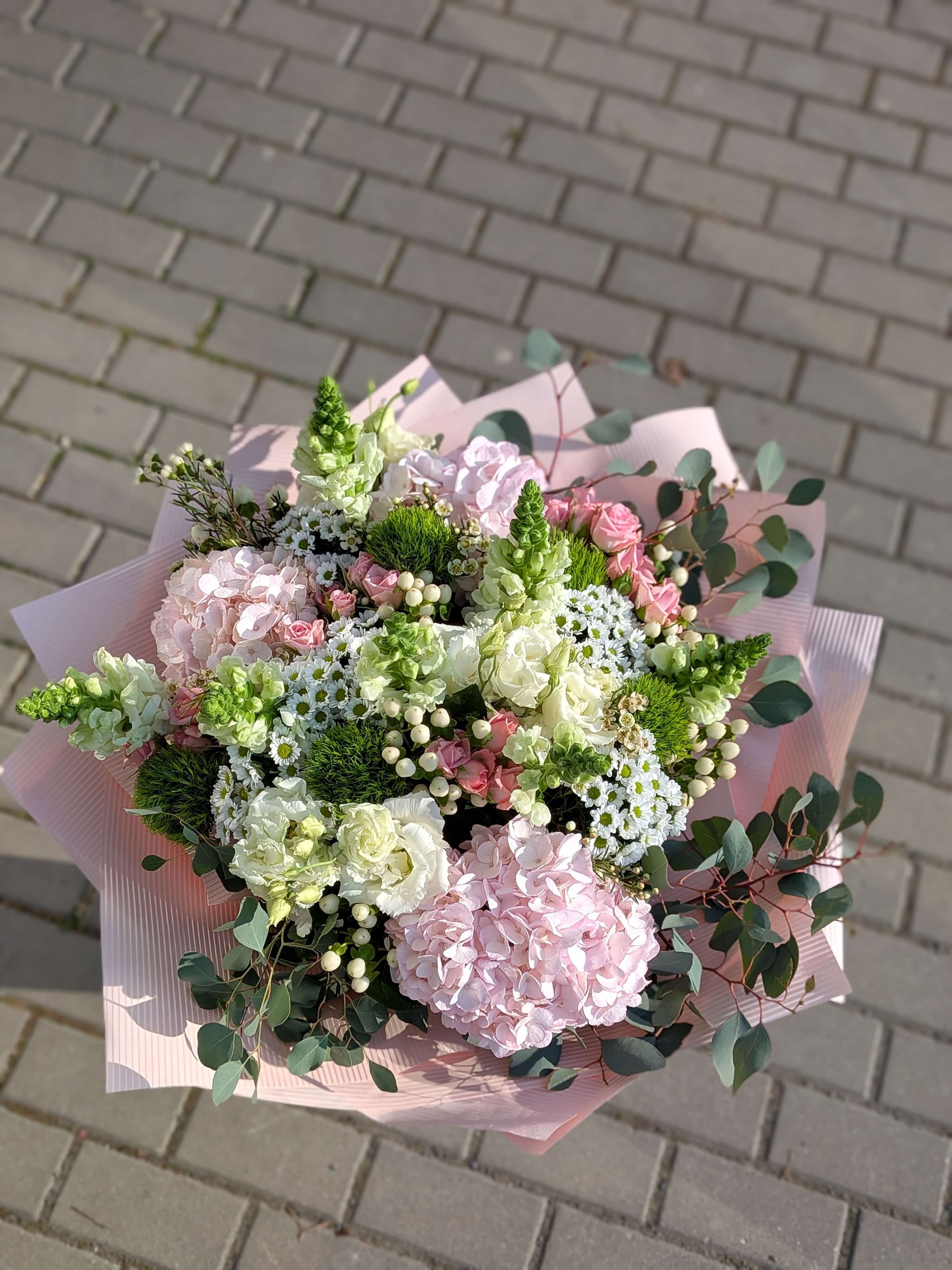 Obrovská kytice v něžných barvách z hortenzií, hledíků, trsových růží, eustom a santinek.