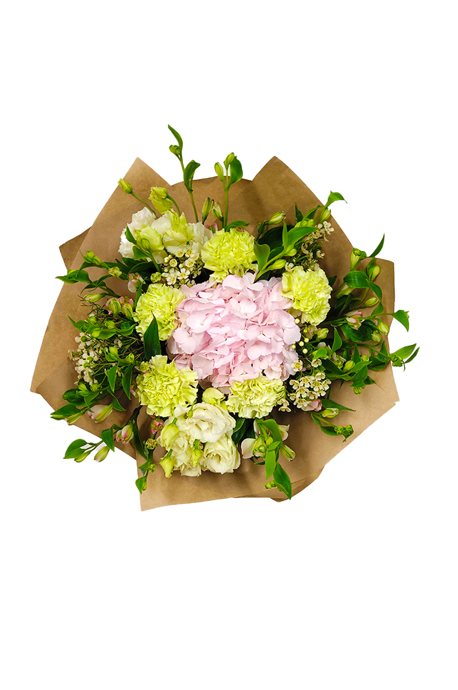 Nepřehlédnutelným středobodem této kytice je velkolepá růžová hortenzie, symbol hojnosti a upřímných citů. Její nadýchanou krásu doplňují čistě bílé eustomy a drobné květy růžových alstromerií, které kytici dodávají lehkost a hravost. Moderní a svěží nádech do vazby vnáší pětice světle zelených karafiátů, které spolu s drobnými kvítky waxu vytvářejí nádhernou texturu a harmonický kontrast.