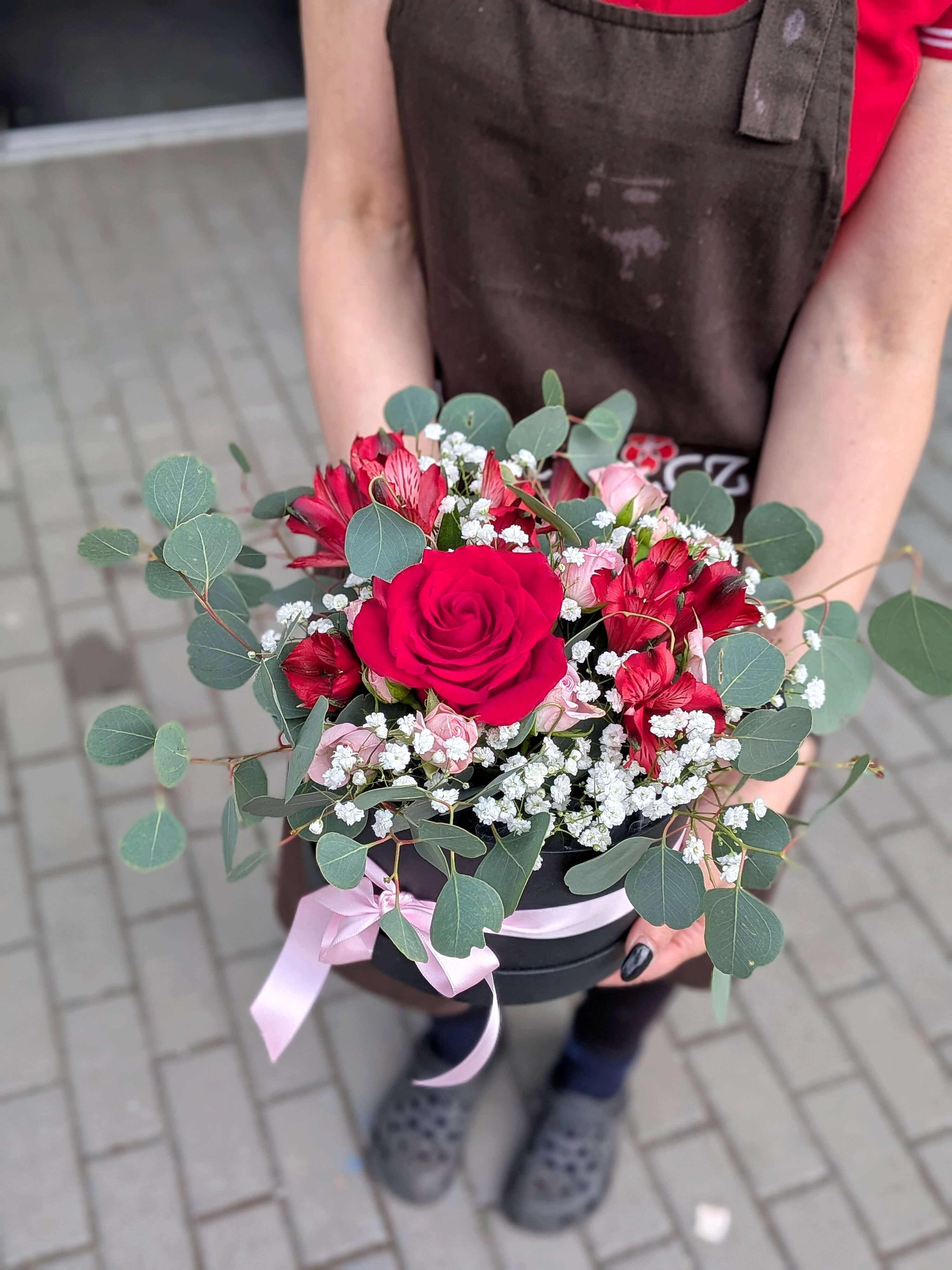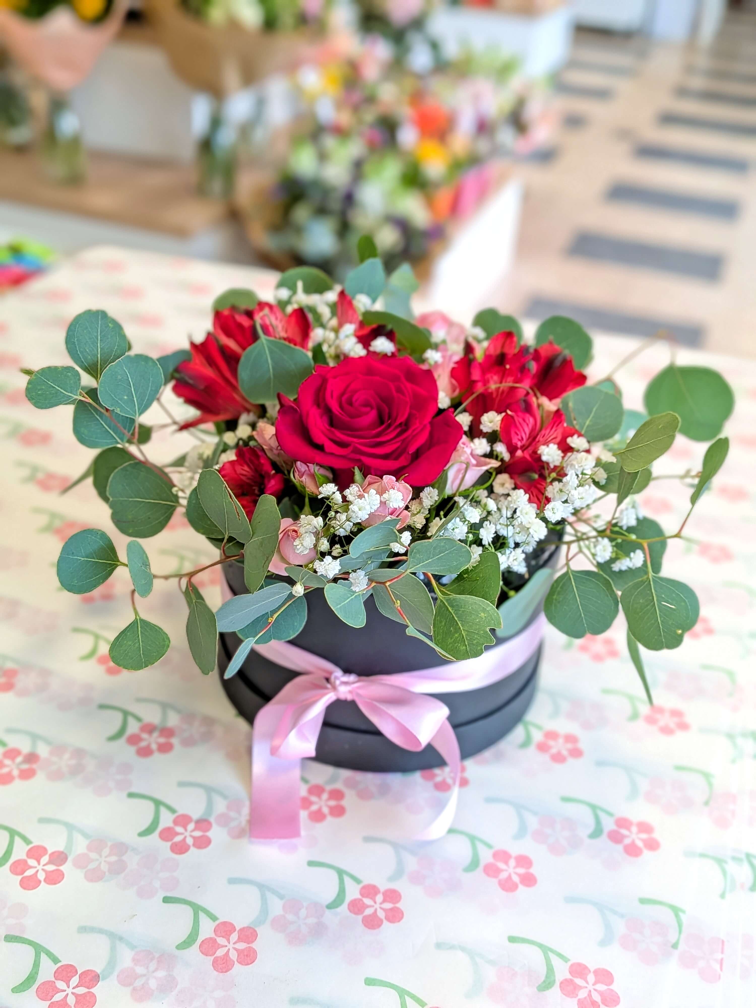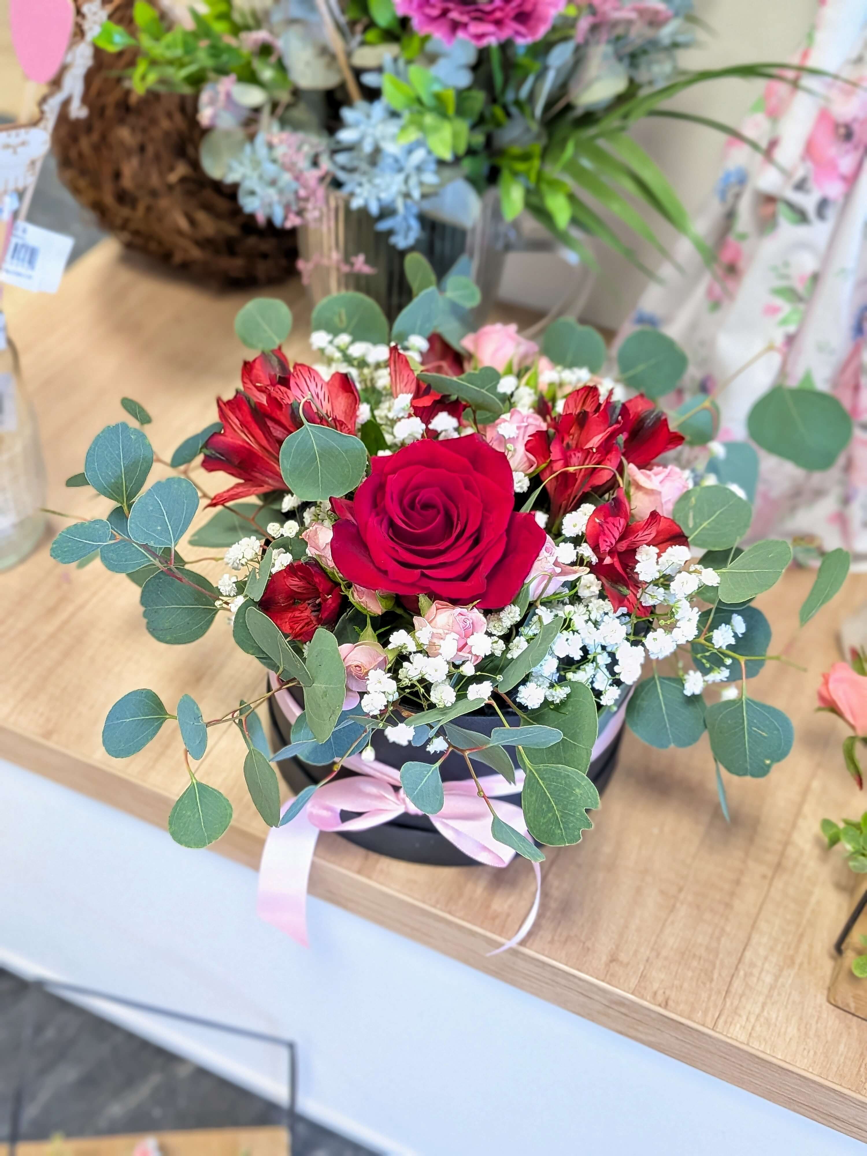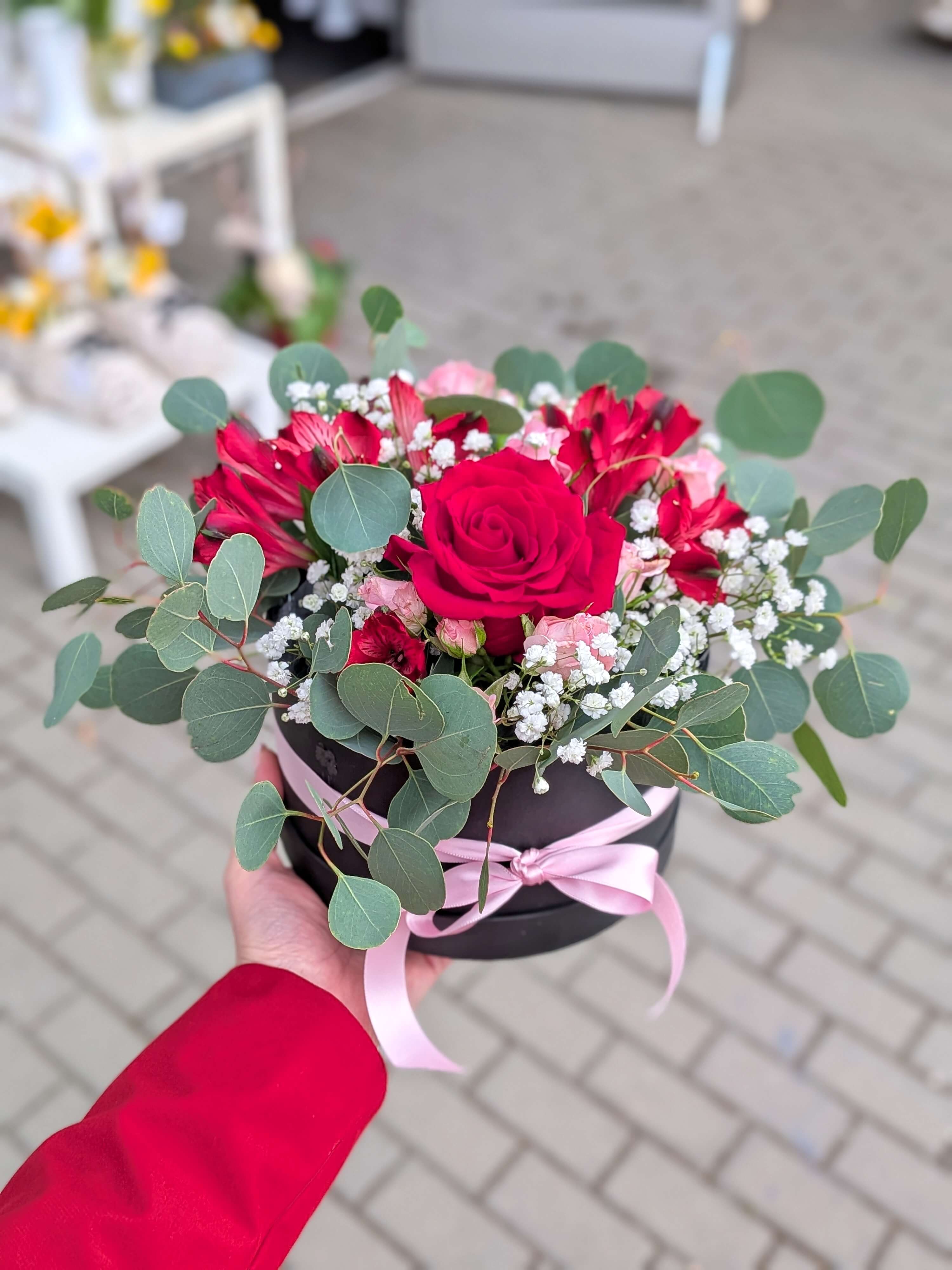Darujte emoce ukryté v barvách. Tomuto exkluzivnímu černému boxu vévodí jedna sytě červená růže, která uprostřed boxu září jako symbol hlubokého citu. Obklopují ji bohaté červené alstromerie a jemné růžové trsové růže, které vytvářejí krásný barevný přechod a dodávají boxu plnost. Celá kompozice je odlehčena bílým obláčkem gypsophily, který v kombinaci se stříbřitým eukalyptem dodává aranžmá moderní texturu a luxusní vzhled.