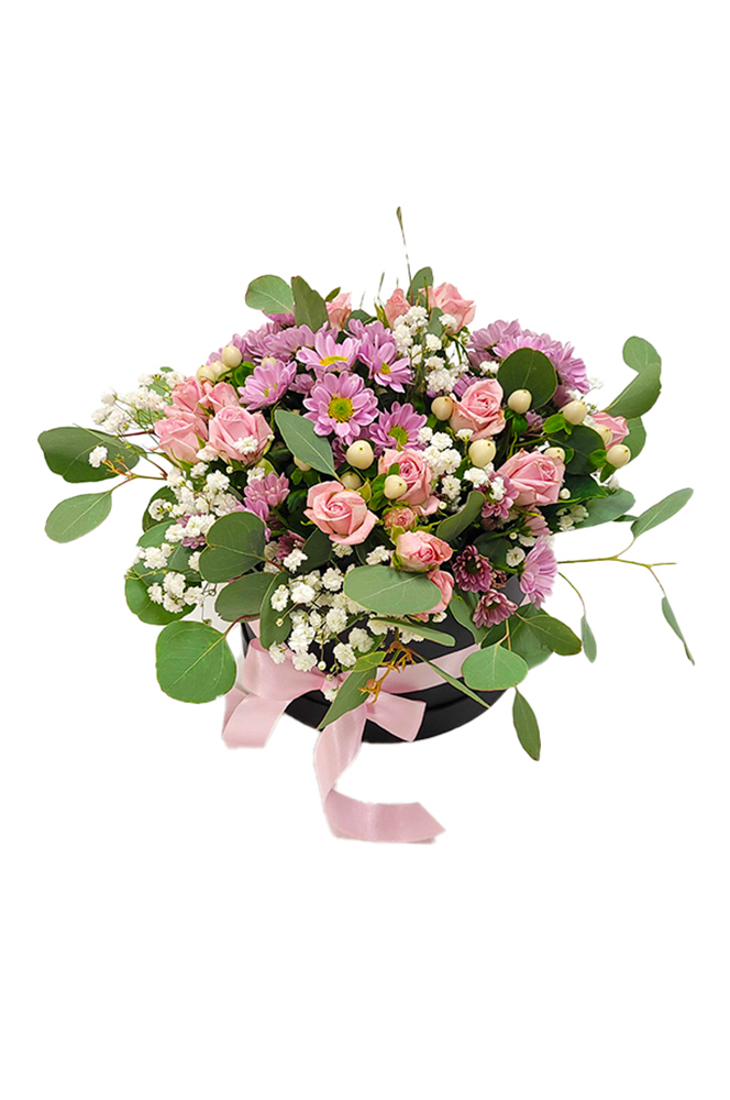 Nechte se okouzlit harmonií něžných barev a stylového designu. Tento exkluzivní černý box v sobě ukrývá bohatou vazbu z růžových trsových růží a sladěných růžových santinek, které spolu vytvářejí nadýchaný a romantický celek. Čistotu a moderní ráz dodávají aranžmá bílé bobulky hyperica, zatímco jemná gypsophila celou kompozici zjemňuje a dodává jí snovou lehkost. Vše je podtrženo stříbřitým eukalyptem, který boxu propůjčuje nejen luxusní vzhled, ale i podmanivou svěží vůni.