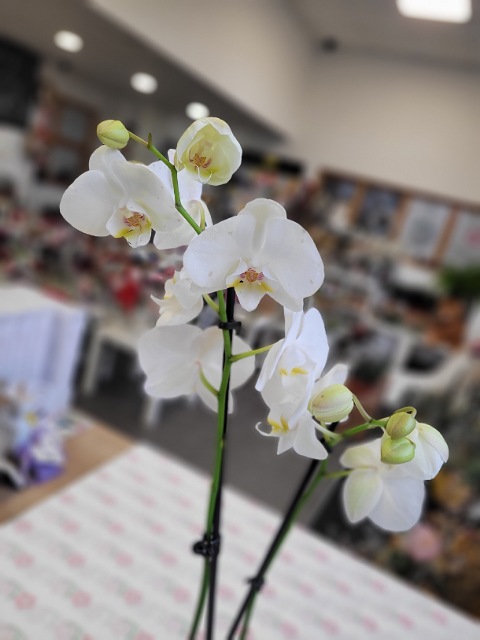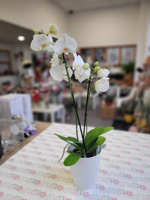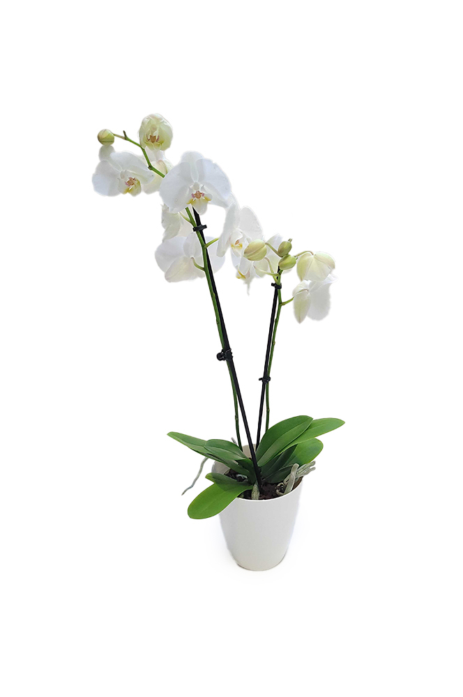 Bílá orchidej Phalenopsis se dvěma výhonky květů v bílém květináči.
