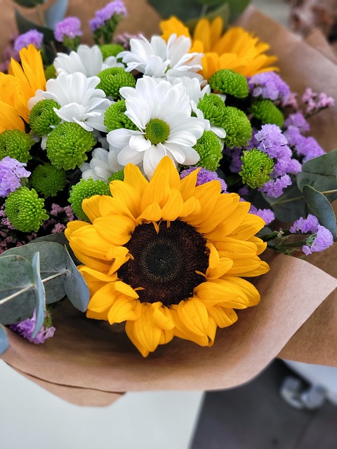 Zářivá kombinace bílé chryzantémy, žlutých slunečnic, santin.