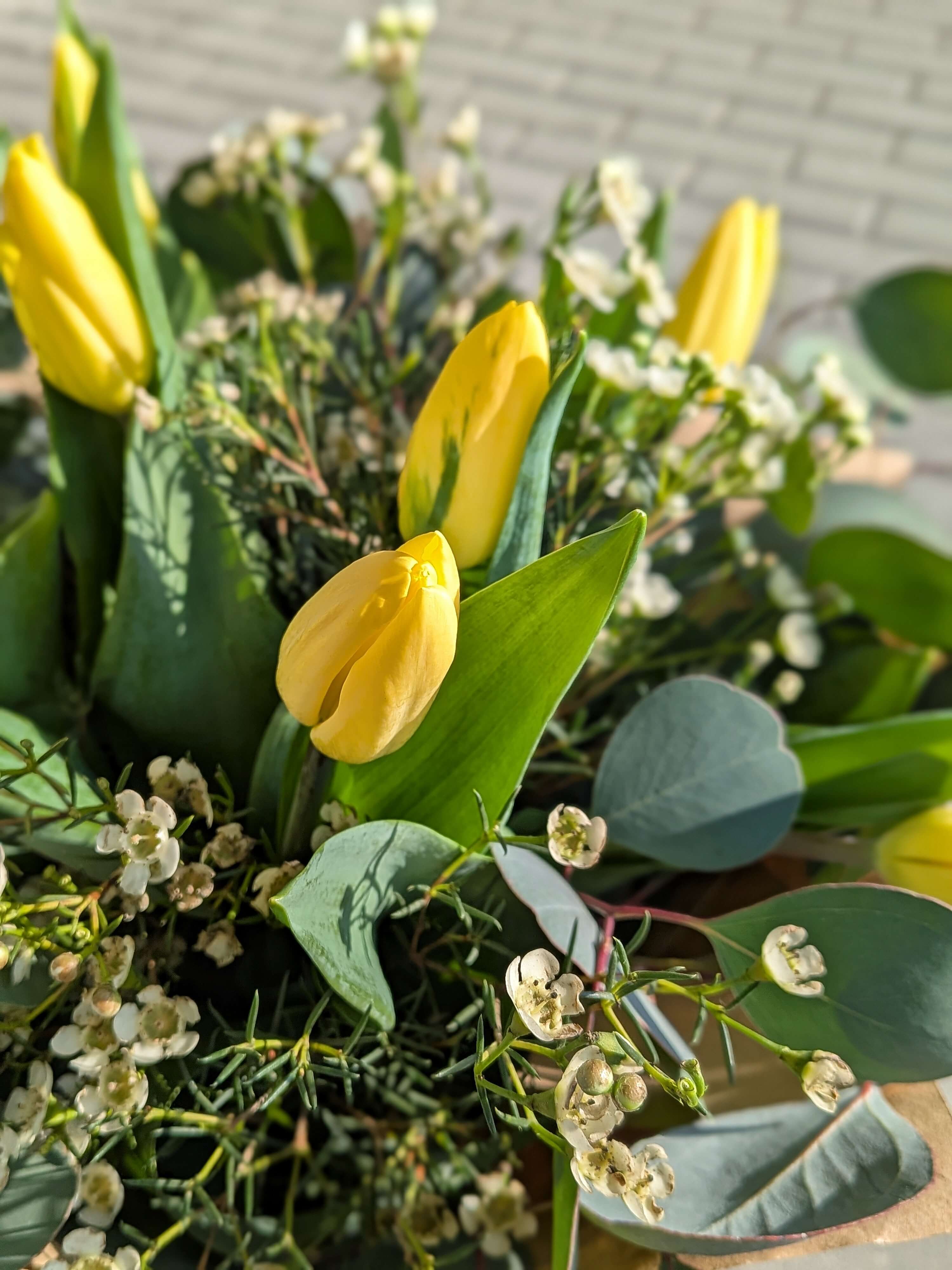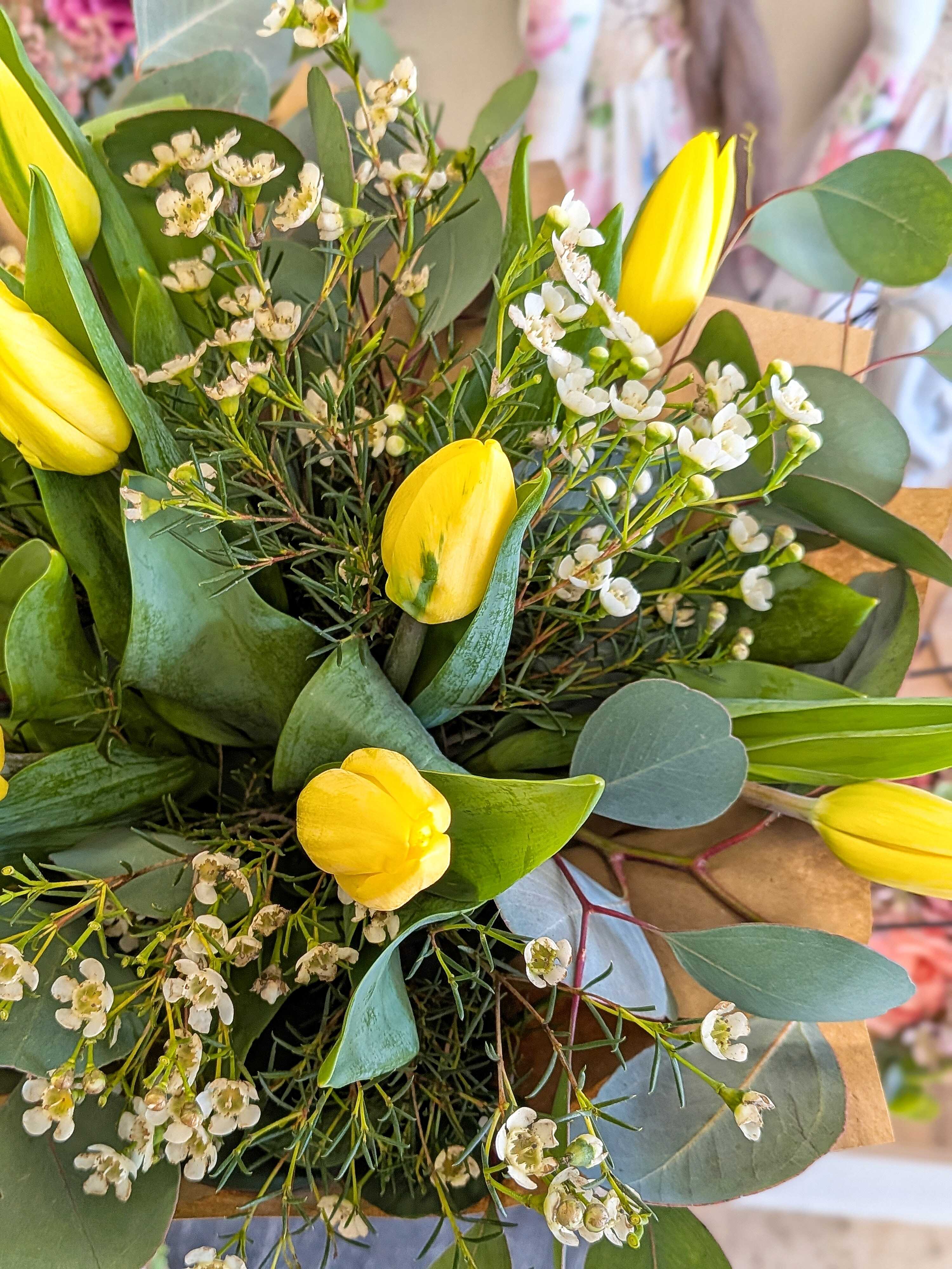 Zářivě žluté tulipány doplněné kvítky waxu a eukalyptem.