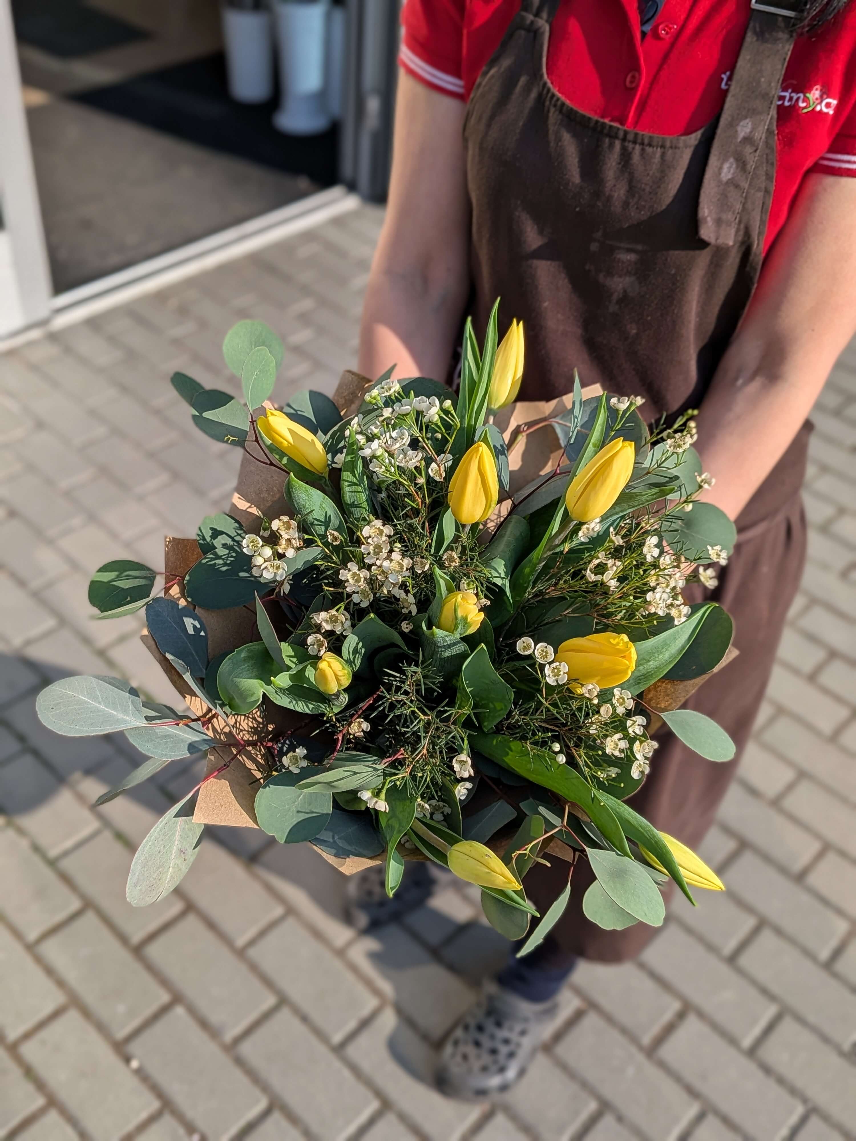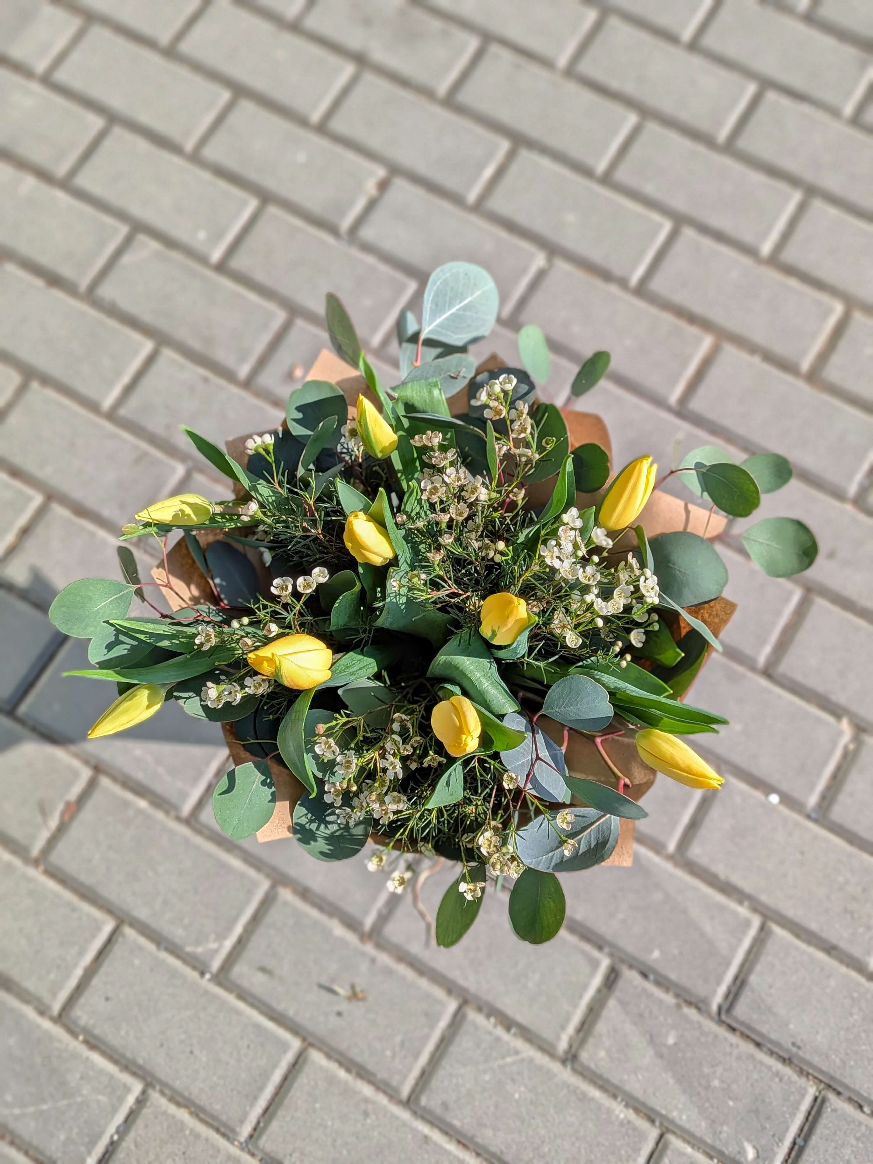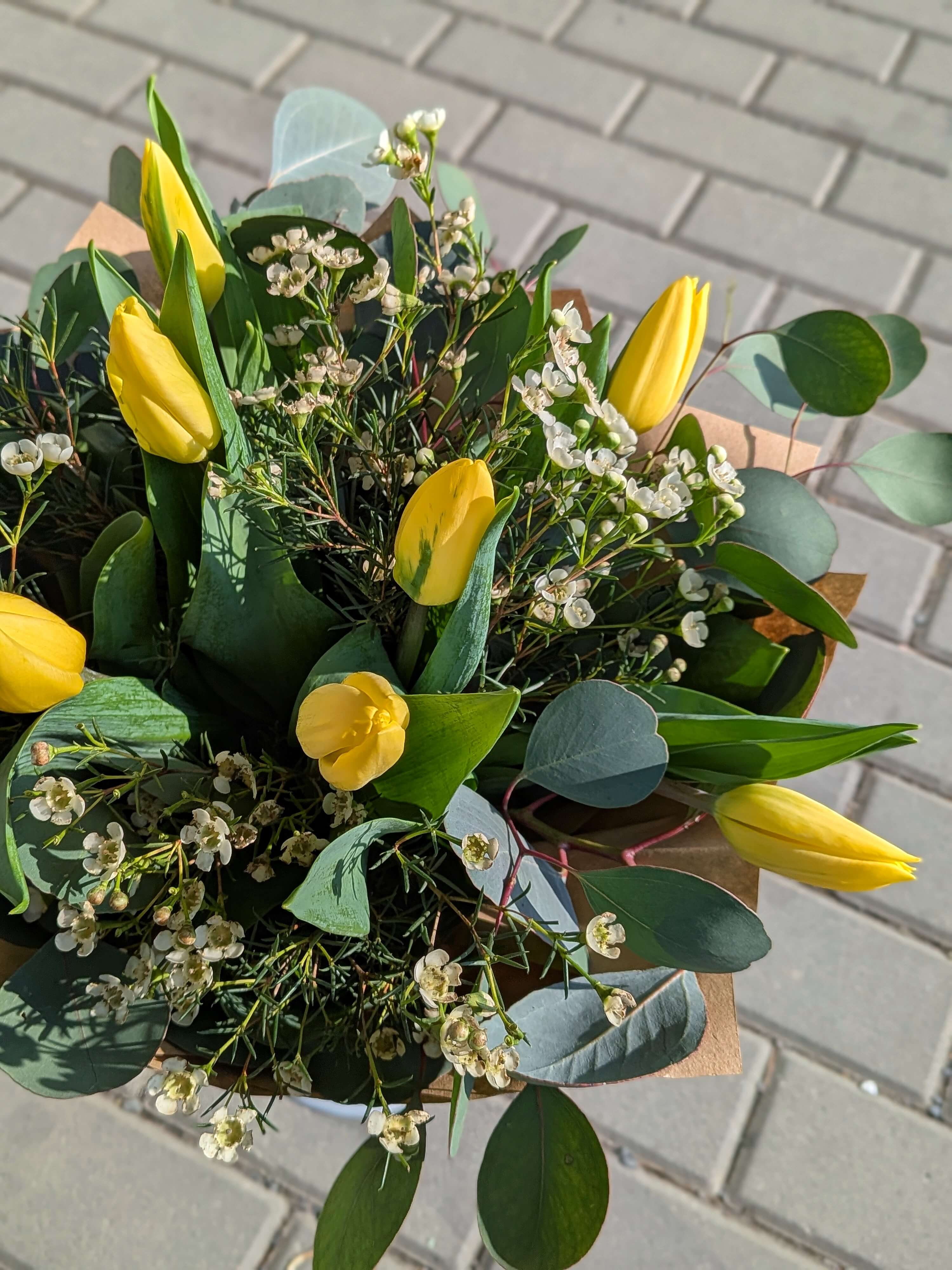 V jednoduchosti je krása, a tato kytice je toho jasným důkazem. Devět zářivě žlutých tulipánů v sobě nese energii prvních jarních paprsků a okamžitě prosvětlí každý interiér. Jejich sytou barvu zjemňují drobné kvítky bílého waxu, které celku dodávají něžnou texturu. Moderní a luxusní ráz kytici propůjčuje penízkový eukalyptus se svými typickými kulatými listy v elegantním šedozeleném odstínu, který navíc krásně a svěže voní.