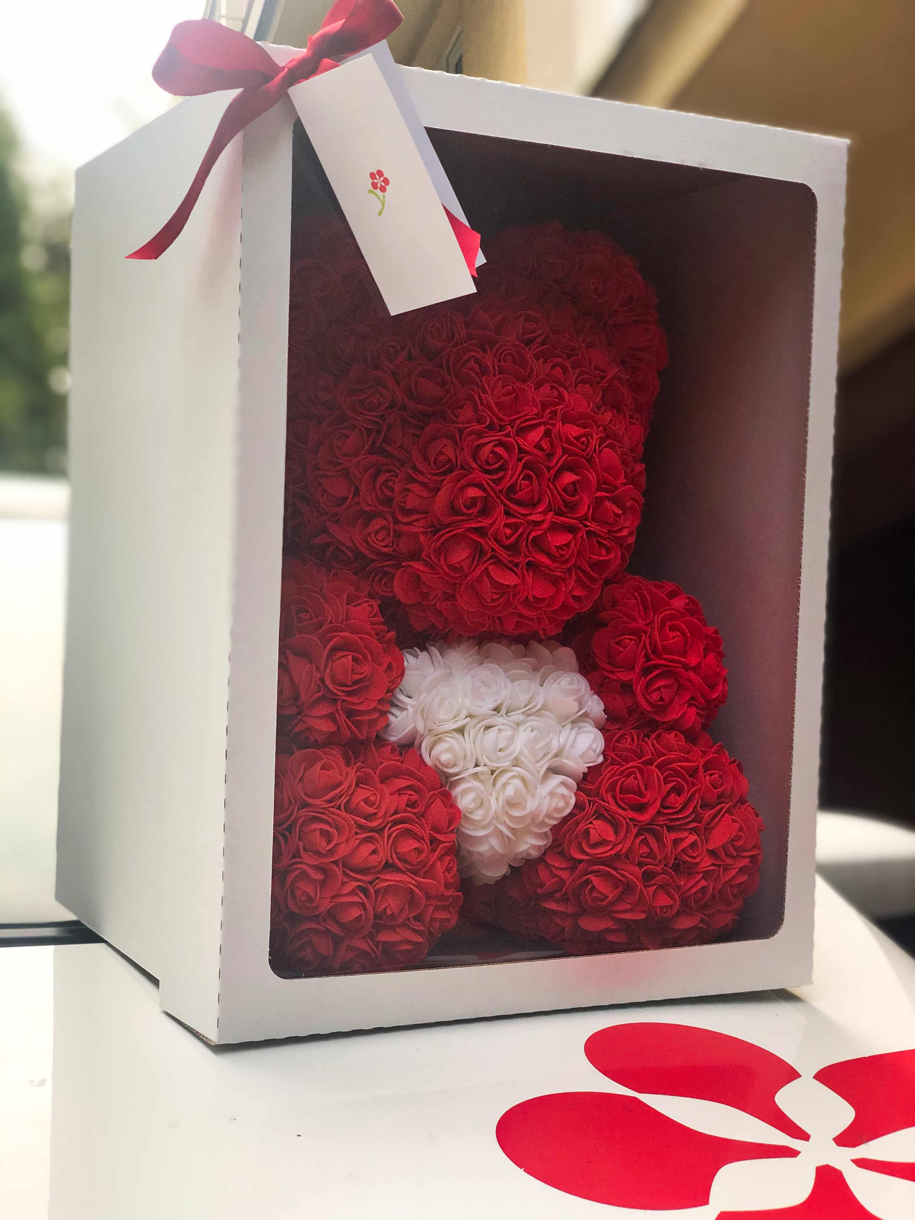 Rose Bear (medvídek z růží) je jedinečný dárek, který je na zcela jiné úrovni. Každý kus působí vyjímečně, je krásně jemný a ručně vyrobený. Medvídek měří 42 cm a je velice jemný na dotek. Naše medvídky si sami vyrábíme v nejvyšší dosažitelné kvalitě. Právě kvalitní materiál a dokonalá ruční práce dodávají naším medvídkům neodolatelné kouzlo. Jsou bezpeční a nezpůsobují alergii. O medvídka není potřeba se starat. Je to ideální a originální dárek pro každou příležitost. Dokonale se hodí na Valentýna, Mezinárodní den žen, narozeniny, svatby a nebo třeba jen tak pro radost.