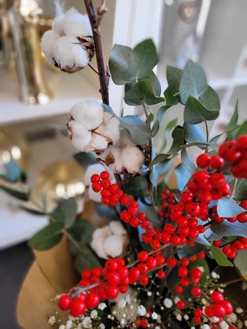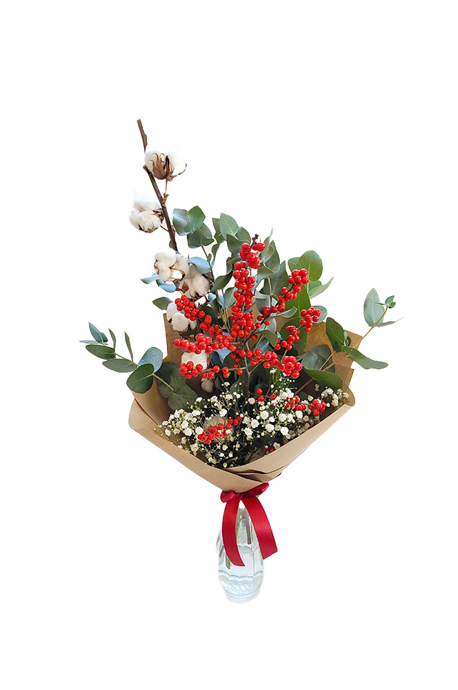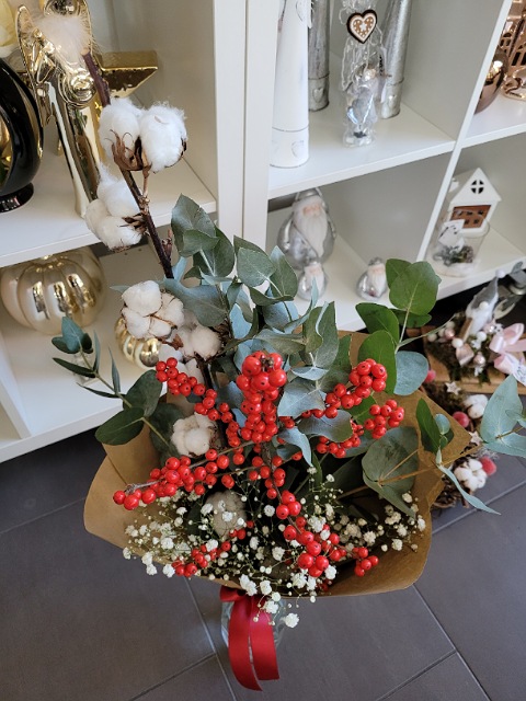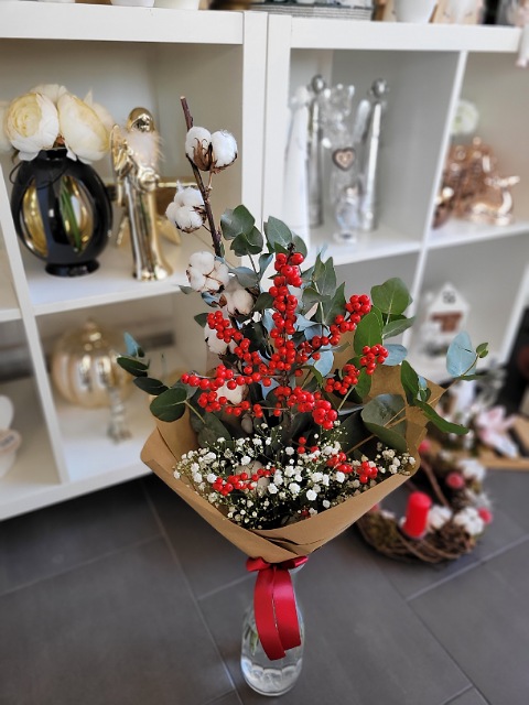 Jemná zimní kytice z přírodních materiálů spojuje měkký bavlník, ilex s červenými bobulemi, svěží eukalyptus a drobnou gypsophilu. Tato elegantní vánoční kytice v přírodním stylu vnese do vašeho domova svěžest zimní přírody a slavnostní atmosféru.