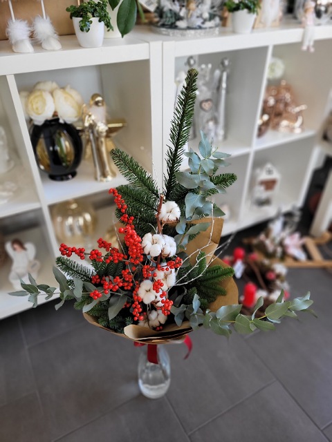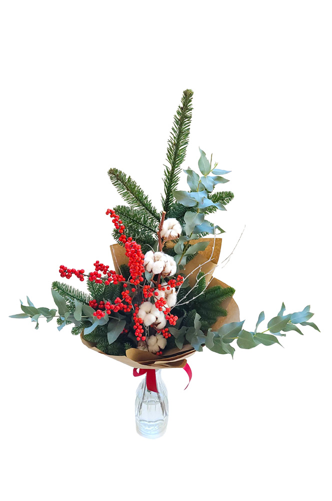 Elegantní zimní kytice z přírodních materiálů spojuje větvičky nobilisu, měkký bavlník, ilex s červenými bobulemi, eukalyptus a bílé větvičky břízy. Tato vánoční kytice přinese do vašeho domova svěžest zimní přírody a slavnostní atmosféru.