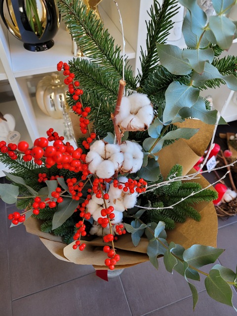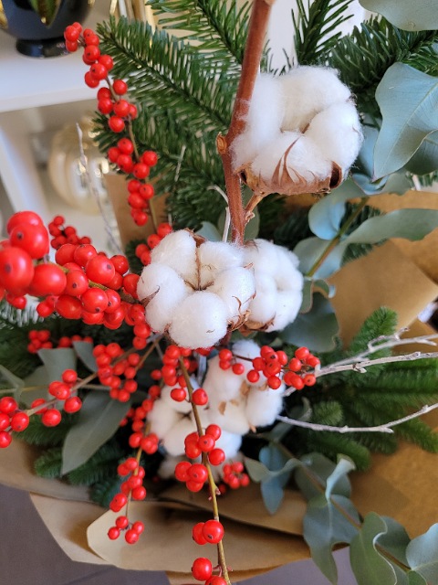 Zimní kytice z ilexu, bavlníku, eukalyptu a větvičky nobilisu.