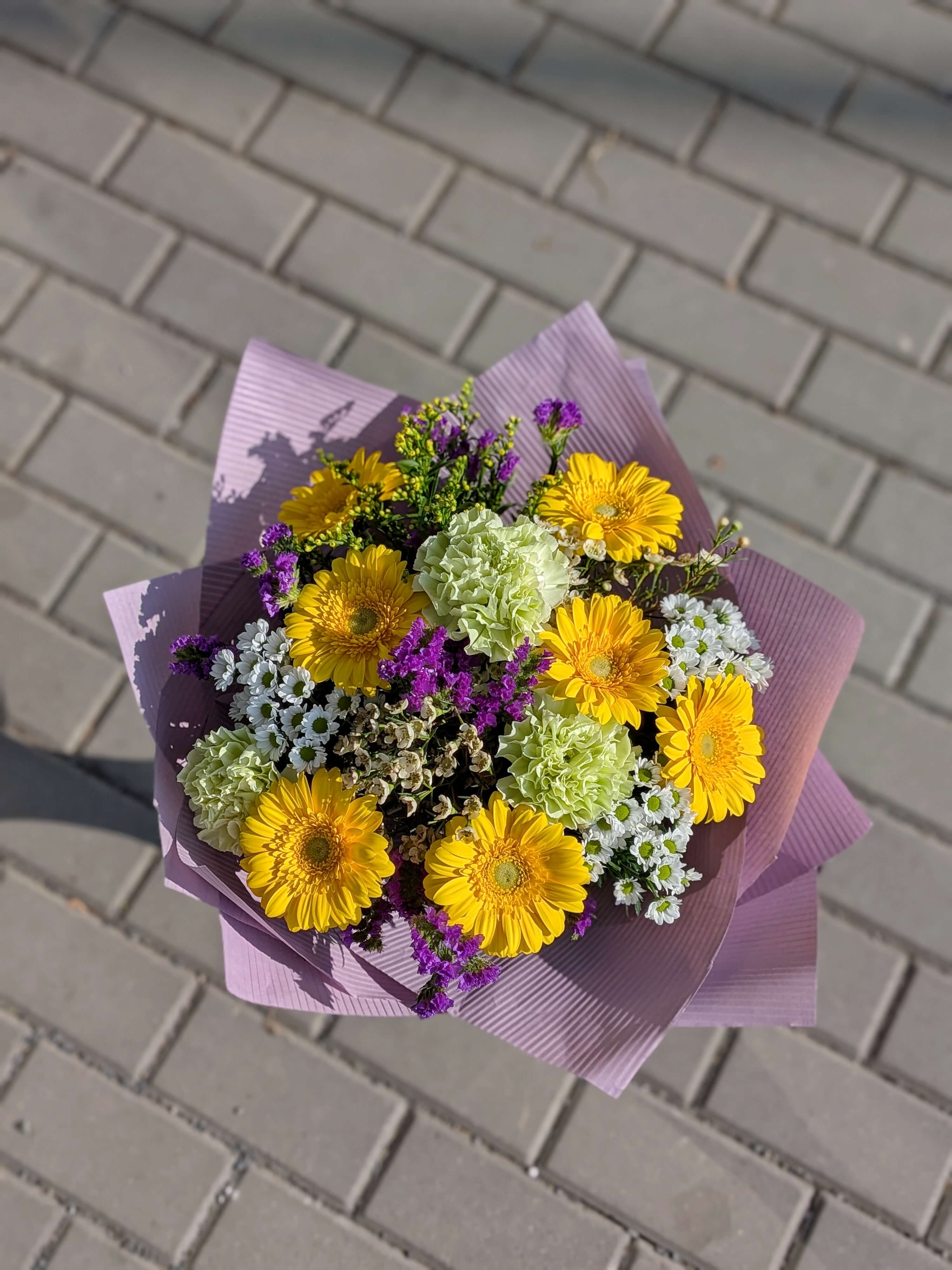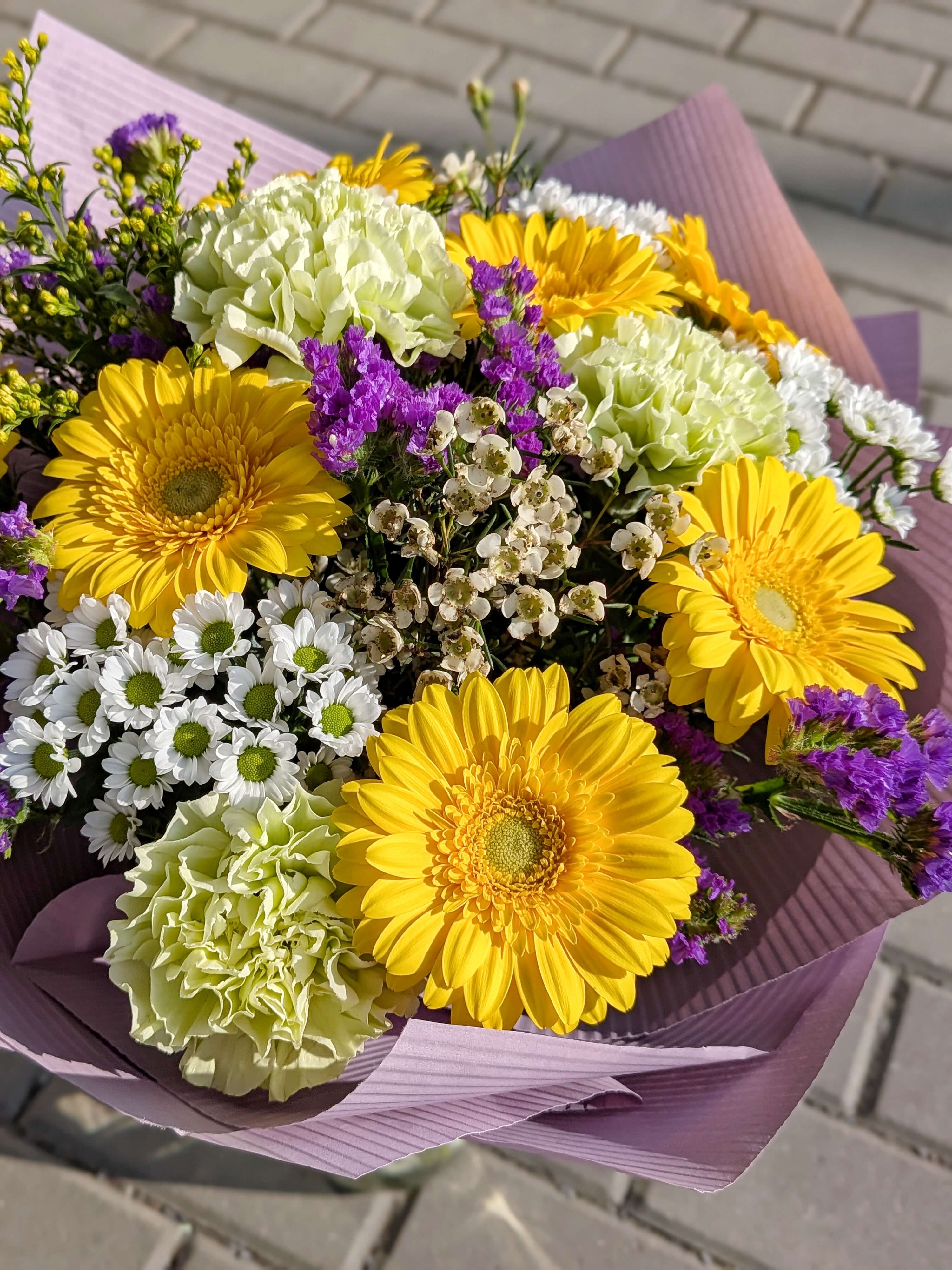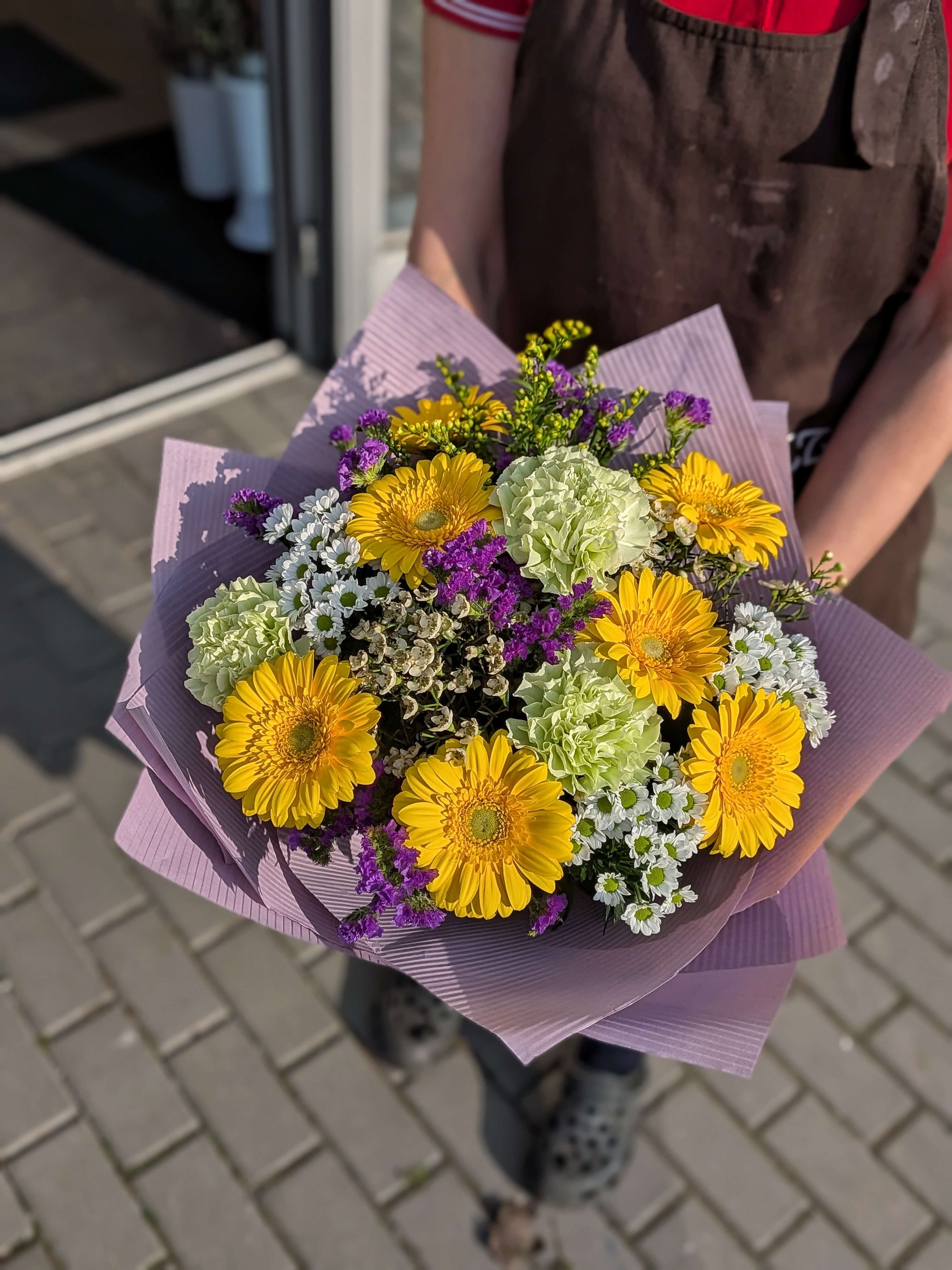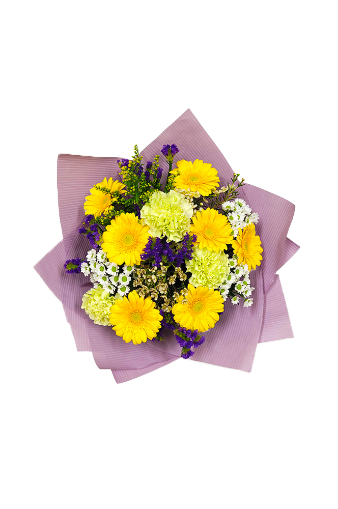 Rozjasněte prostor touto zářivou kyticí, která v sobě nese energii slunce a svěžest jarní louky. Hlavní roli zde hraje sedm sytě žlutých germin, které tvoří dominantní a veselý střed celé vazby. Ten vkusně doplňují tři světle zelené karafiáty, které dodávají kytici moderní šmrnc a neotřelý barevný kontrast. Bílé santinky a jemný wax celou kytici zjemňují, zatímco zlatavé solidago a statice dodávají vazbě bohatý objem a krásnou přírodní texturu.