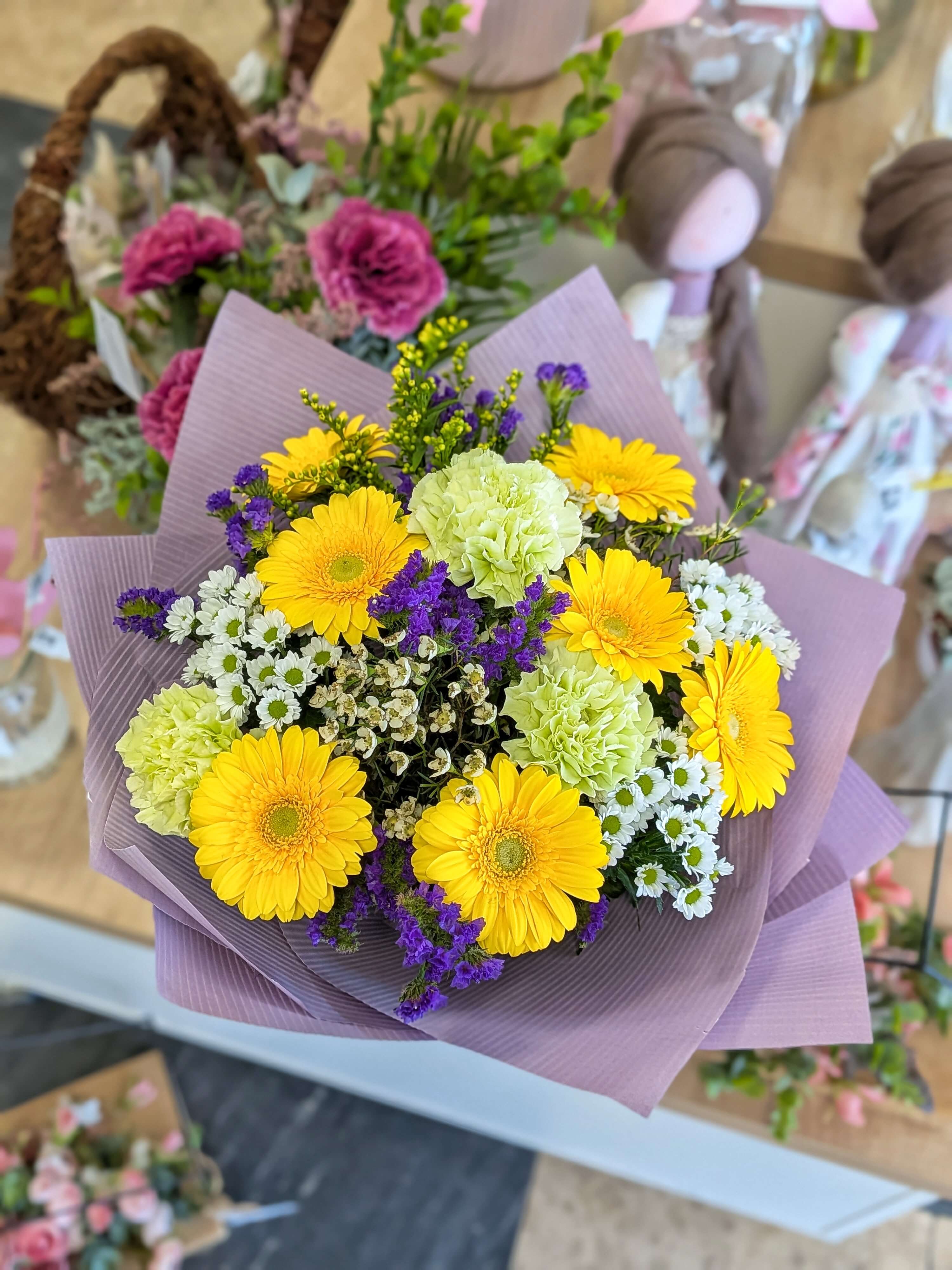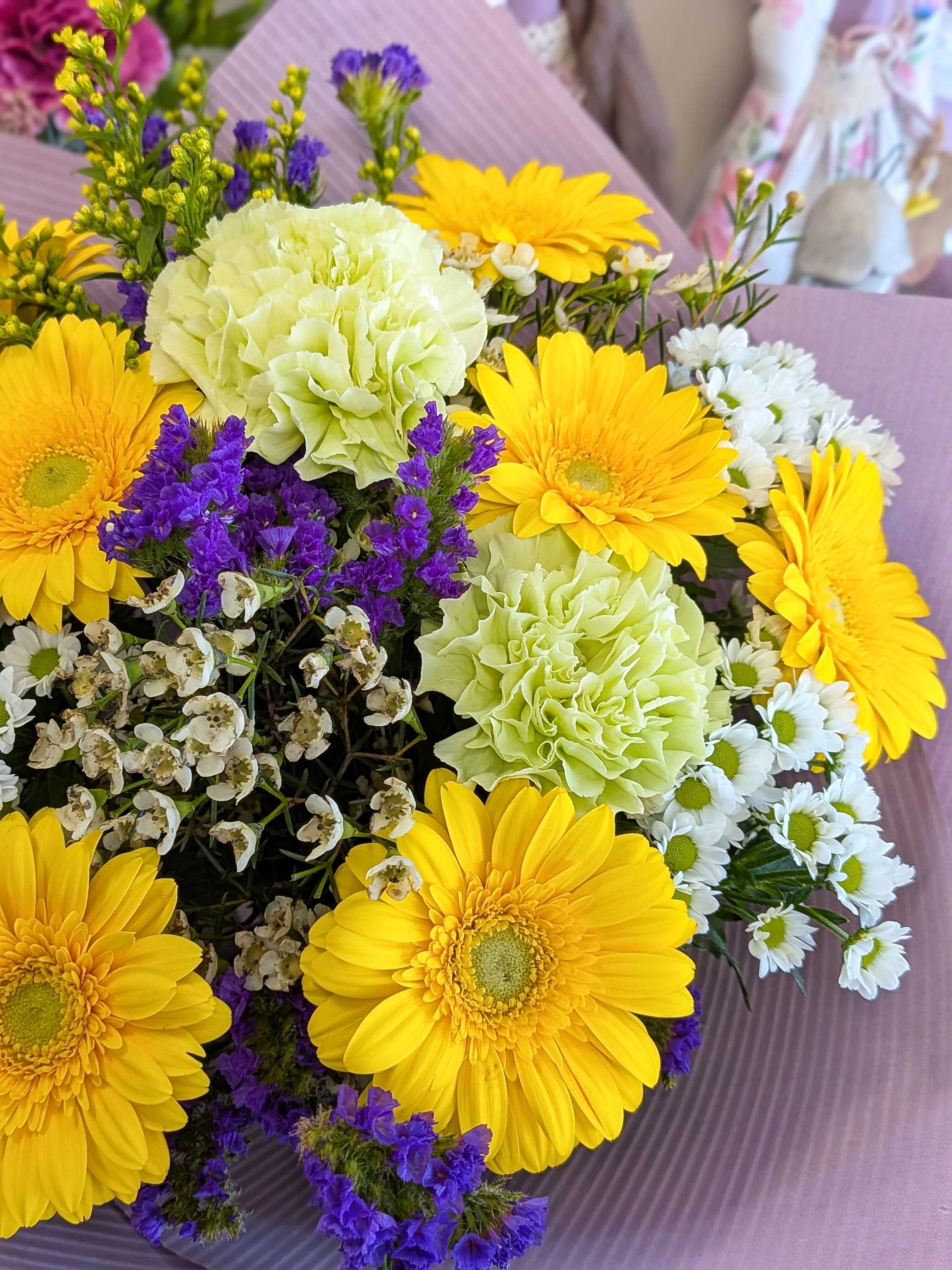 Zářivá kytice žlutých germin, světle zelených karafiátů a něžných santinek s kvítky waxu a statice.